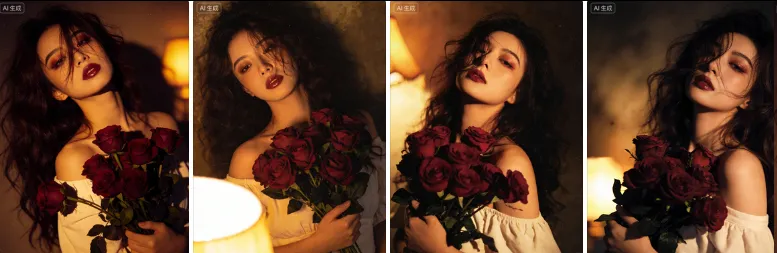 帮我生成图片:以第1张图片为原型,去除背景、衣服和发型,完全保留面部特征与五官特点。生成20-25岁东亚女性鹅蛋脸,深棕色大波浪长卷发蓬松凌乱,几缕垂落遮挡眉眼或脸颊;手捧深红色玫瑰花束(饱满层次丰富,深红花瓣配墨绿枝叶),身穿奶白色露肩上衣;无耳环,背景为暗调焦糖褐/深杏色哑光墙面(自然明暗不均+陈旧质感)。昏暗柔和暖光(low-key暗调,侧前方散射光源如黄昏/昏黄台灯,光线边缘模糊,面部明暗过渡柔和,暗部细节隐约,高光仅眼眸唇部微弱光泽),自然慵懒淡妆(野生眉、深棕/酒红色晕染眼妆、自然阴影轮廓、深玫瑰豆沙色哑光唇)。色调为浓郁复古暗调暖棕系(深焦糖、琥珀棕、暗酒红为主,高饱和低明度,暗部深褐高光暖黄,覆暖褐色滤镜),画面带明显复古胶片颗粒感+柔焦朦胧效果(眼部对焦边缘柔化,轻微镜头暗角)。氛围慵懒颓废神秘疏离,眼神迷离空洞,动作:后仰靠姿花束垂身前。生成xx张人物不同角度的图片,比例 3:4