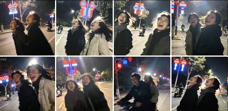 帮我生成一组xx张图:运用日常抓拍且富有情绪感的视觉风格,展示了图中人物,呈现出醉态,正肆意夸张地笑着。采用非对称构图进行斜向拍摄,画面有动态模糊,人影重叠,面部过曝,有着粗颗粒的质感,色调低饱和度,柔焦且高噪点。场景是在夜晚的大马路上,充满了梦幻朦胧的感觉,逆光带来发丝光,侧光和头顶光都很明显,发丝在风中拂面。背景里有街道、树木以及一位骑电动车的人,新年红蓝白街灯挂在树上,两人穿着冬日的衣物。原比例