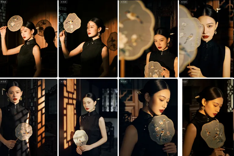 ①中景平视,人物侧身,举起花鸟团扇,强烈的金色聚光灯穿过扇面,在人物身后的暗调木质背景墙上投下清晰的苏绣花鸟影子,人物脸部保留在千净受光区不过曝