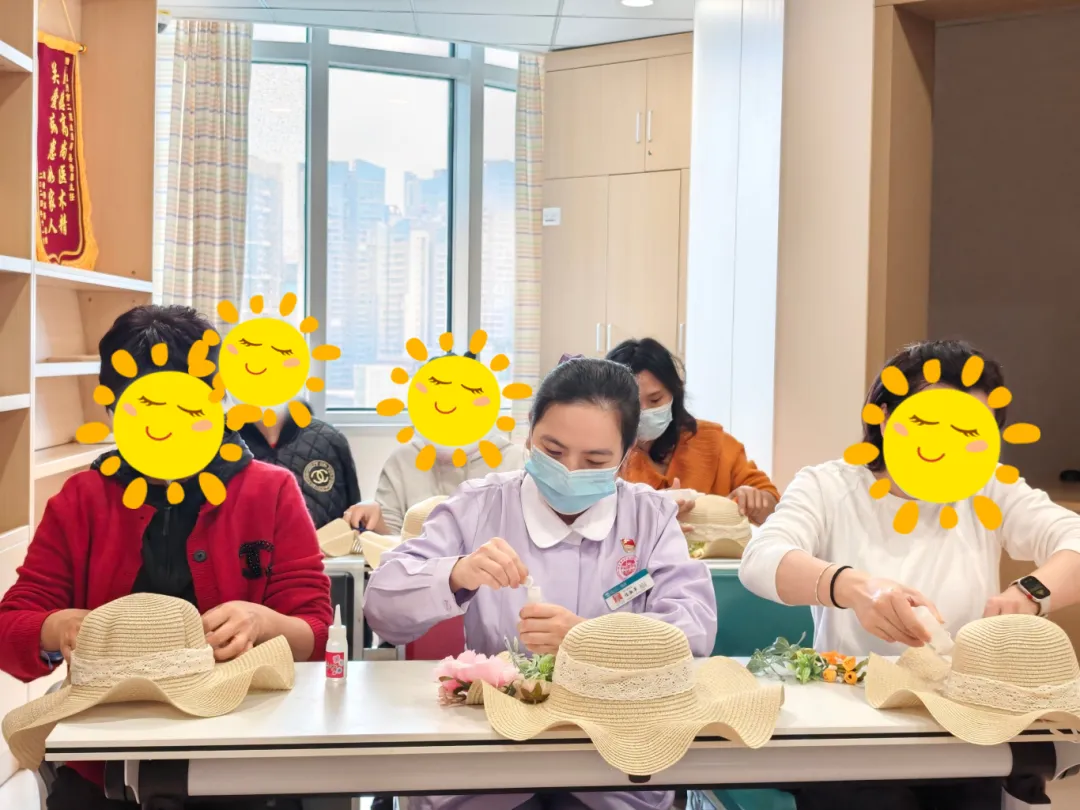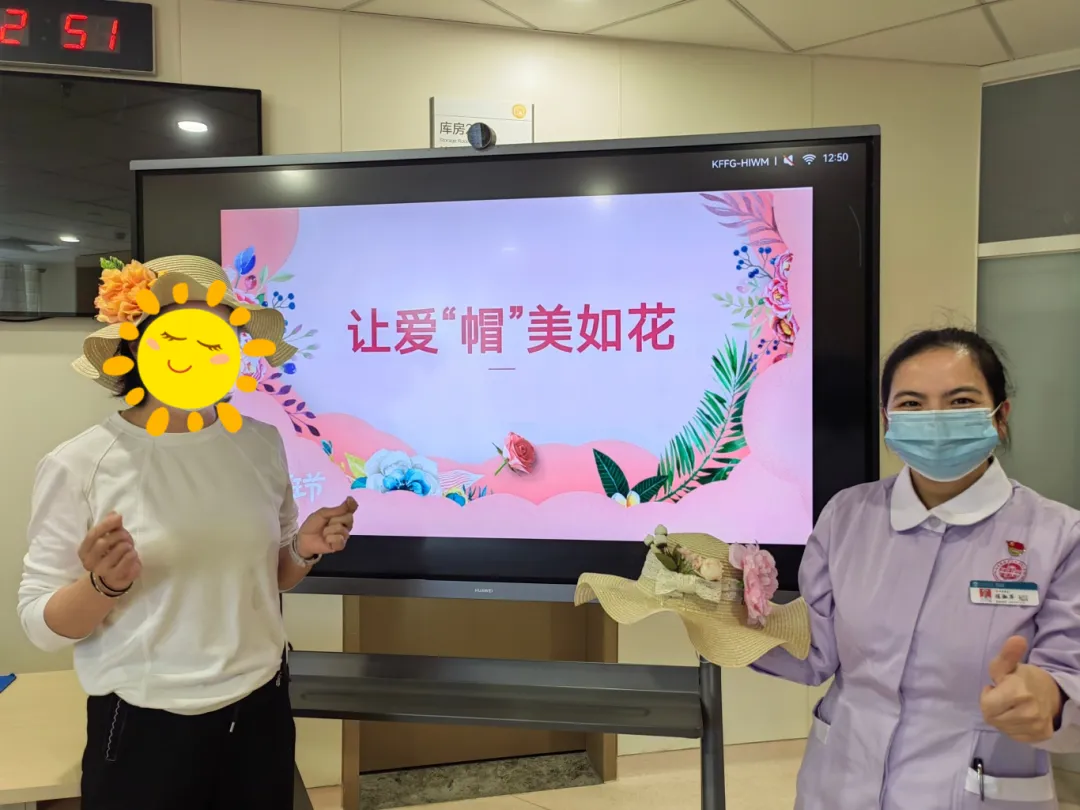 考虑到许多女性患者在治疗过程中可能面临脱发的困扰,血液科医护人员特别策划了花艺草帽DIY活动活动现场,花香、笑语、轻声交谈交织成温暖的画面,她们将一朵朵干花、一片片绿叶,用心点缀在草帽之上。“以前长发飘飘时最爱买帽子,今天能亲手做一顶,感觉特别有意义。”一位患者戴上刚完成的草帽开心地说,并笑着让护士帮她拍照。这份手作的温暖,将陪伴她们在治疗路上,心有繁花,一路芬芳。