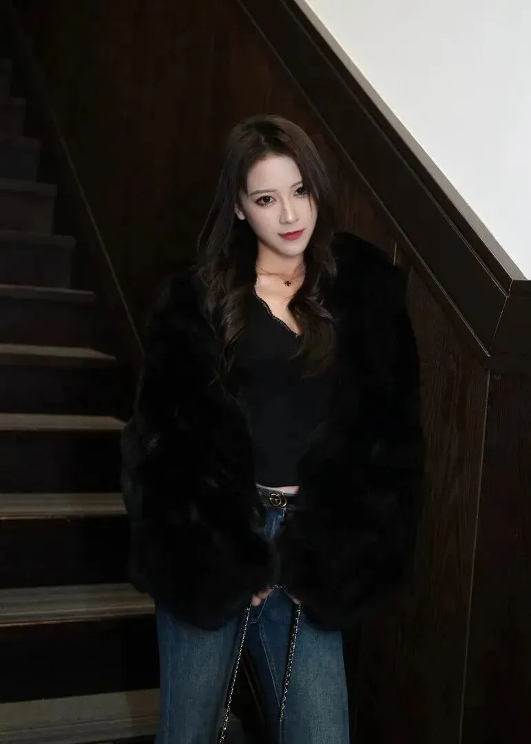 外套黑色毛绒,暖和舒适,亲肤。它自身的材质自带贵气,蓬松的质感让人产生一种特别的温柔,像一只蜷缩在沙发上的猫一般地慵懒而又优美。里面有一件V领蕾丝打底的衣服,轻盈透明的蕾丝边增添了一份优雅的质感,还可以悄无声息地调节领口。下身是蓝色牛仔裤,版型简单,但超级百搭,正好中和上衣厚重感,整个显得不拖沓。