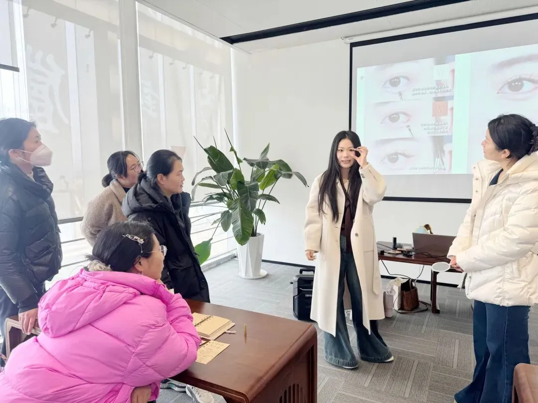 课程中,李老师从面部光影学入手,详细讲解了如何通过高光与阴影的搭配来重塑面部轮廓,以及如何根据五官特点调整眉形与眼妆风格,让大家明白美妆不仅是技术的堆砌,更是对面部美学的艺术雕琢。在实操环节,李老师现场邀请模特进行演示,一边操作一边细致讲解每一个步骤的要点与避坑指南。最后,学员们在李老师的指导下开始动手练习。针对学员们在眼妆晕染不自然、修容显脏等进阶操作中常见的“痛点”,李老师走下讲台,深入学员中间,进行一对一的精准指导与手法纠正。通过手把手的教学,许多学员攻克了“手残”难关,现场学习氛围浓厚,互动频繁。