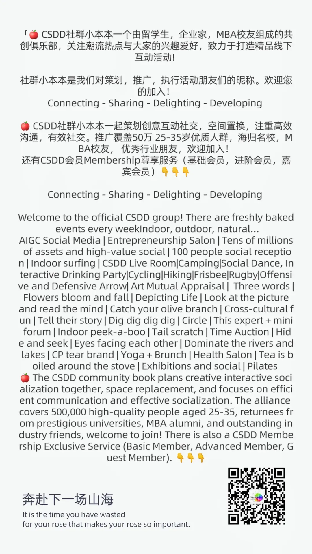 🍎🍏 "CSDD Community is a co-creation platform composed of international students, entrepreneurs, MBA alumni, and outstanding friends in the industry, focusing on trendy hotspots and everyone's hobbies, and is committed to creating high-quality offline interactive activities!