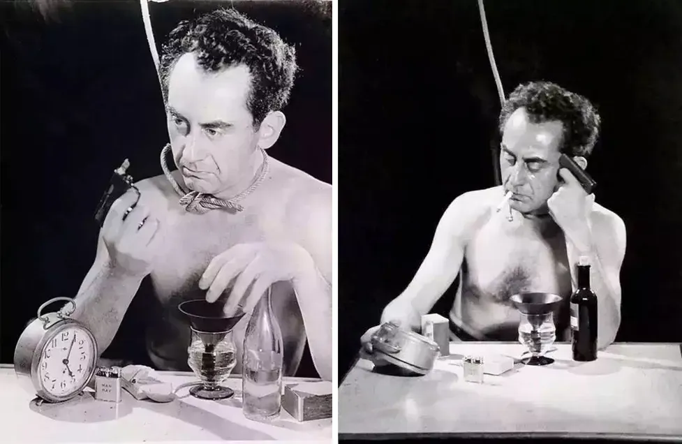 他甚至曾经准备好了绳子与枪支,作出殉情的姿态,摄影后将照片寄给远在美国的米勒。