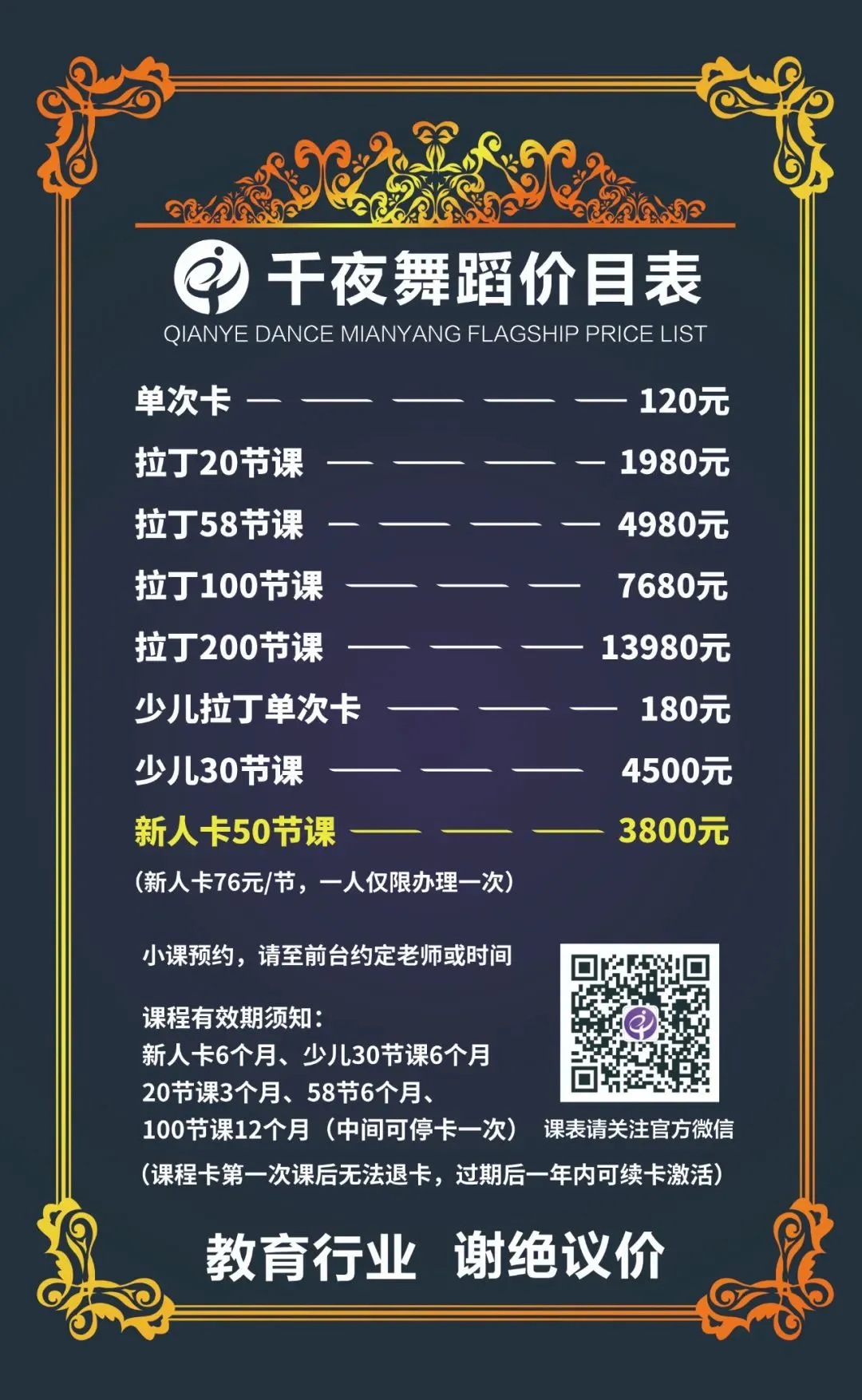 一、老带新特惠活动:即日起,千夜老学员介绍新学员前来,并办理100节以上任意课程卡,双方均可获赠5节课时,活动长期有效!快拉上你的小伙伴一起来跳舞吧!