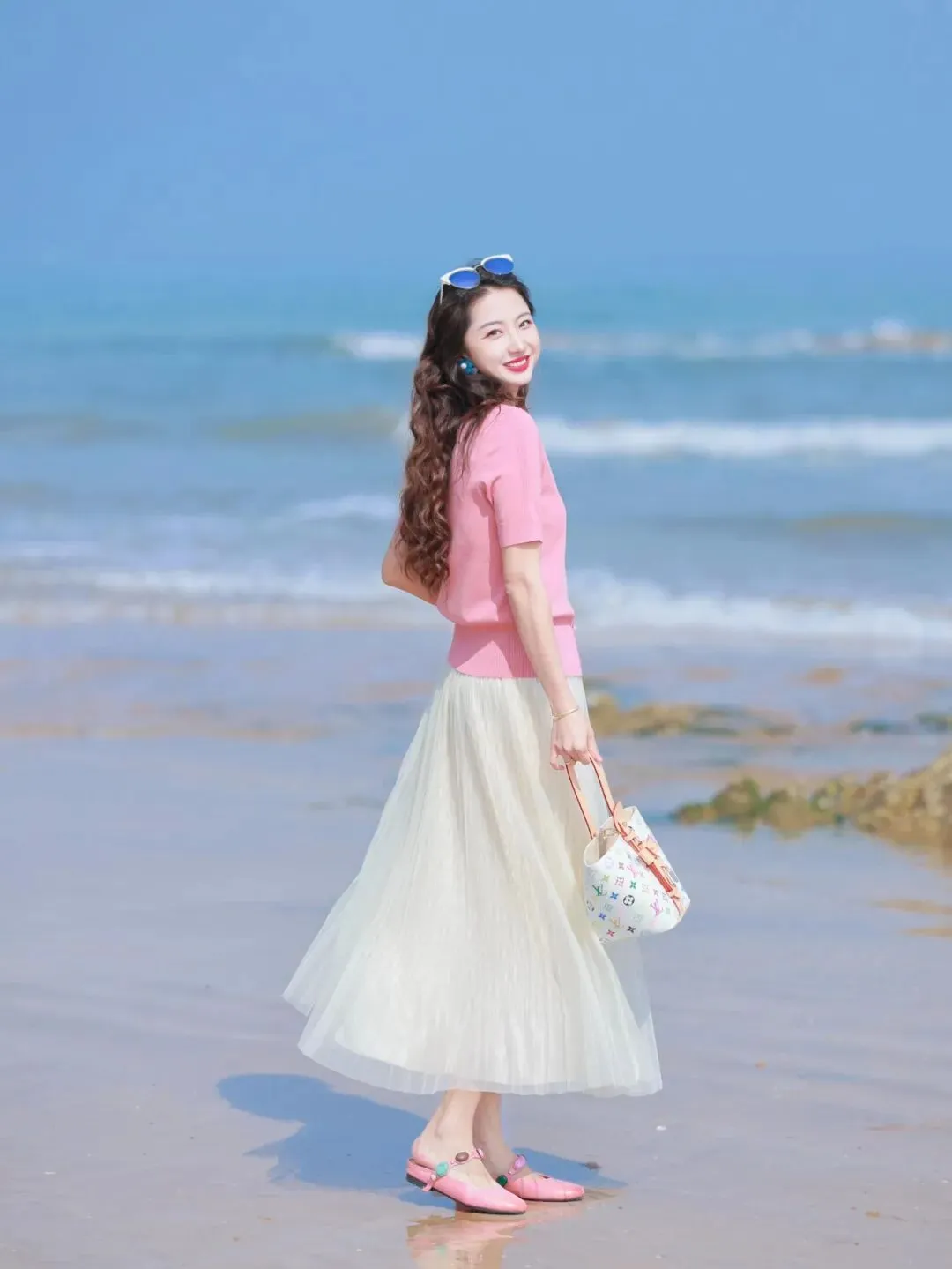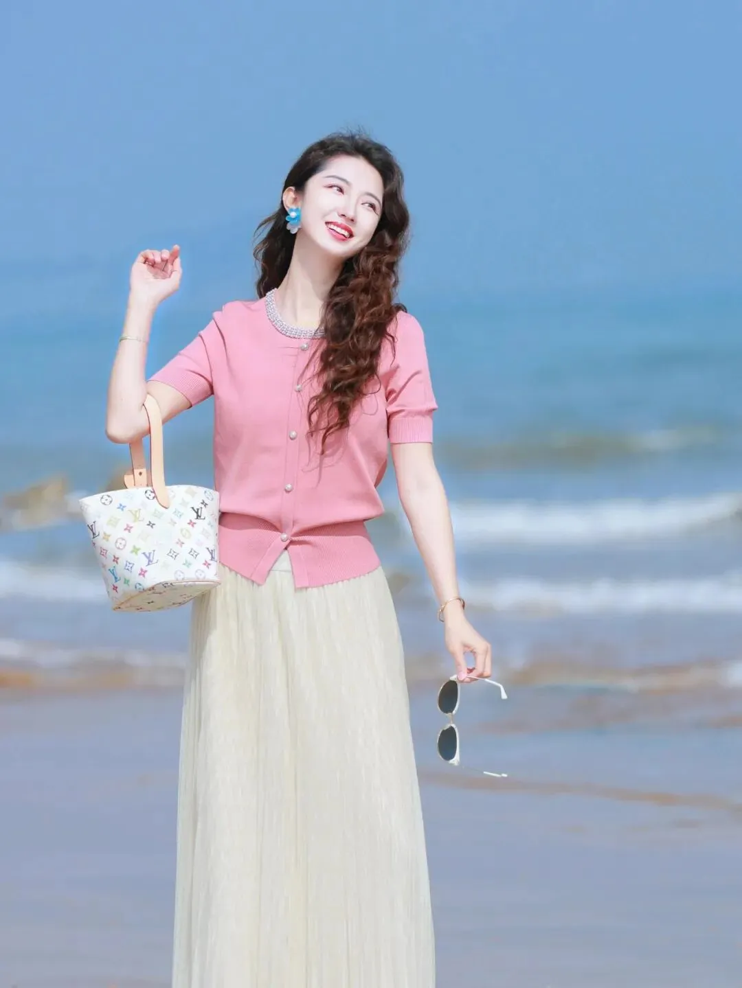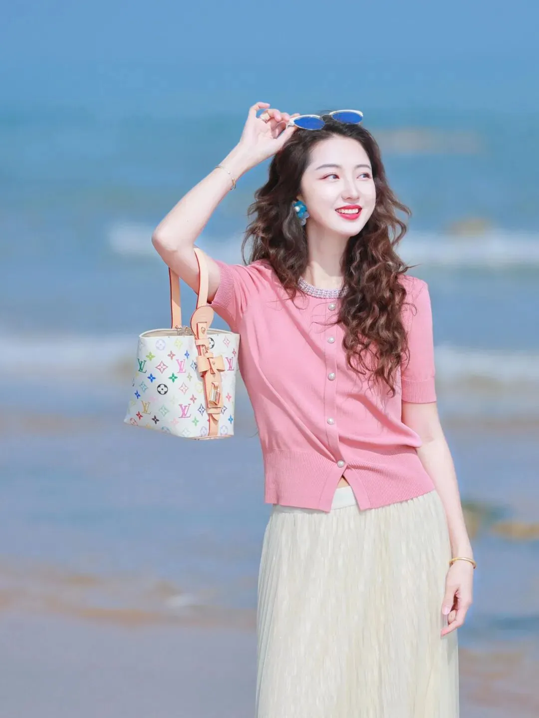 单手挎着包,墨镜搭在指尖,她没有看镜头,只是微笑着走向远方。那种从容和优雅,像是电影里的主角,每一个跨步都藏着风情。
