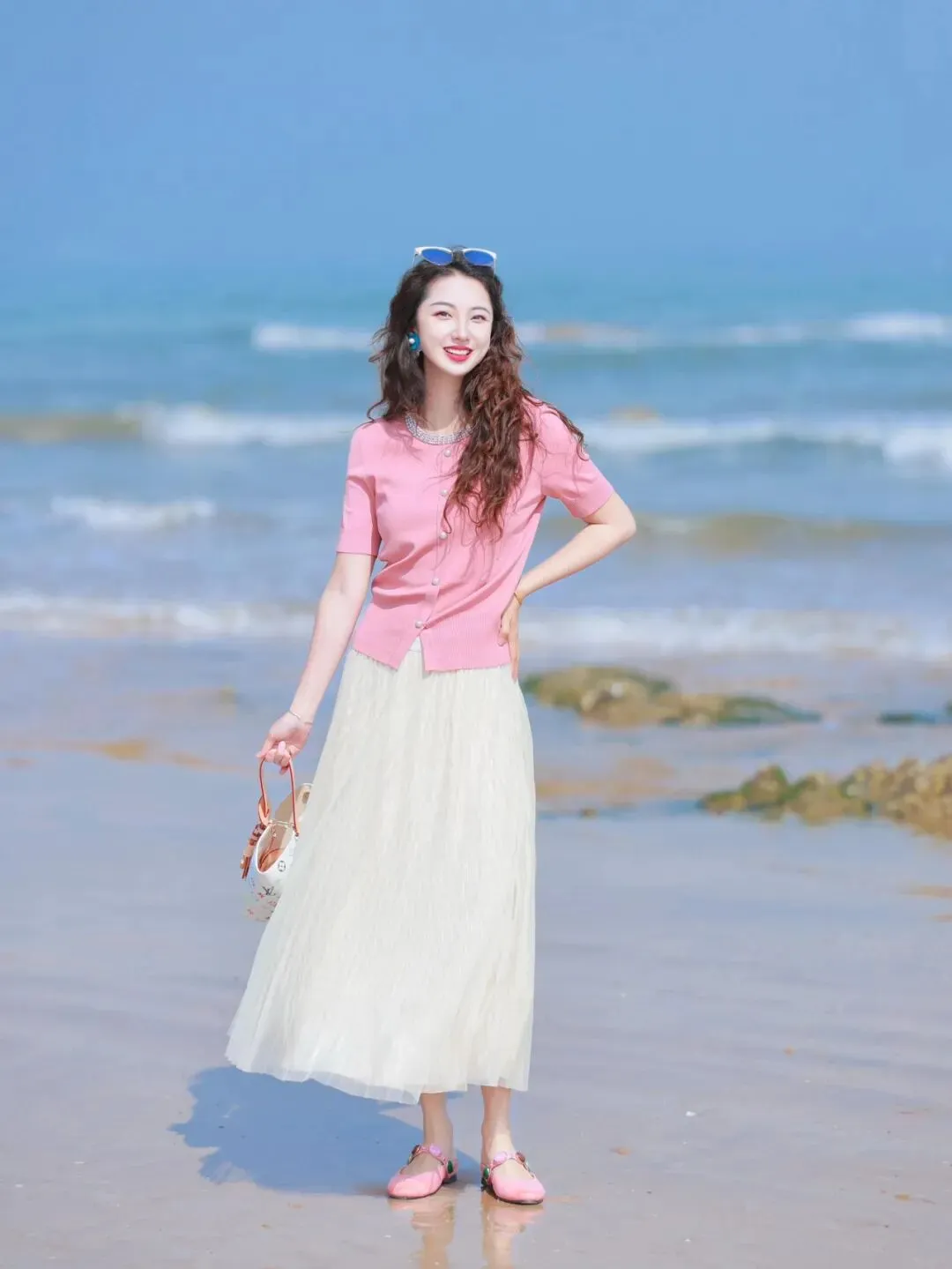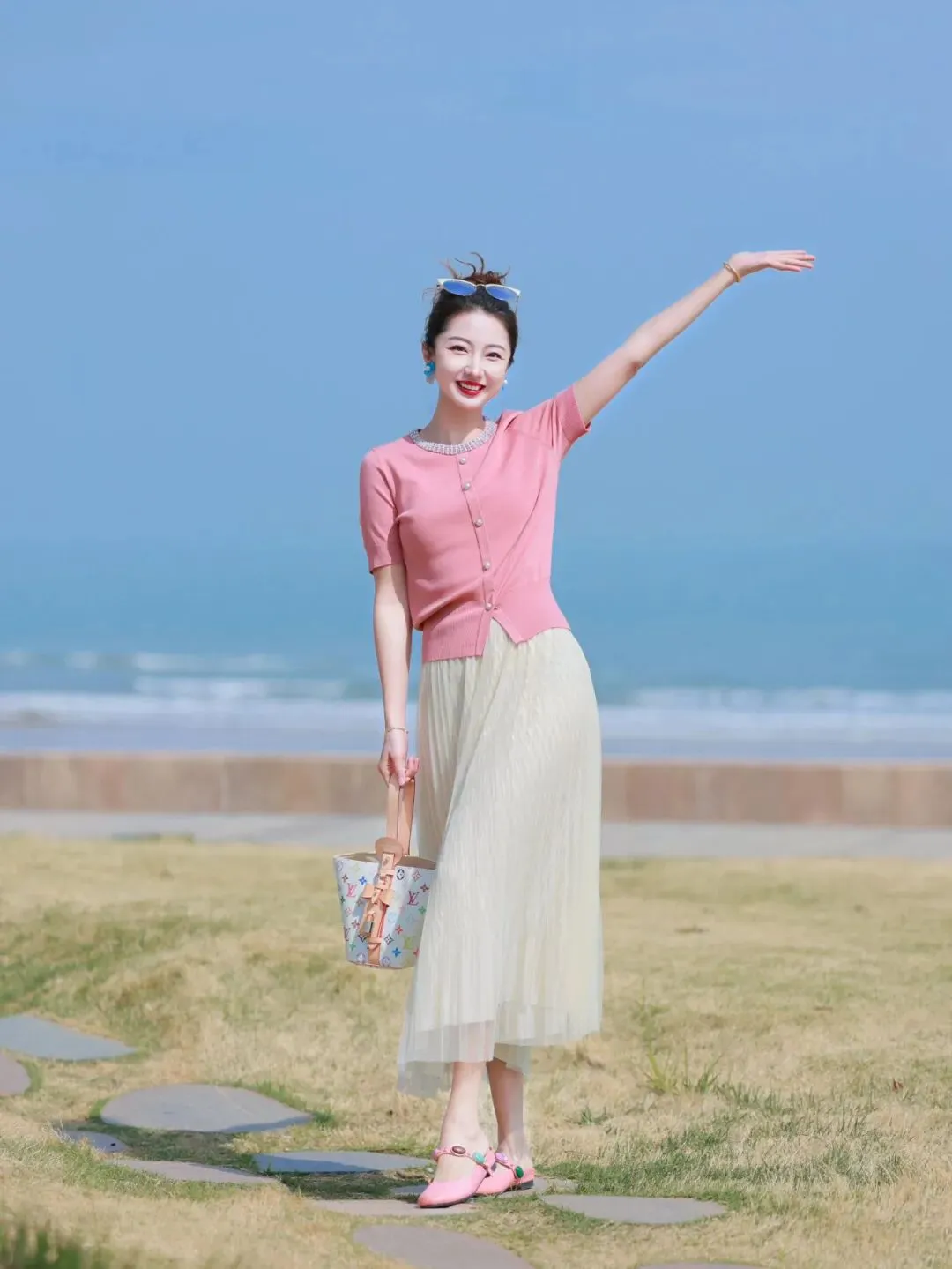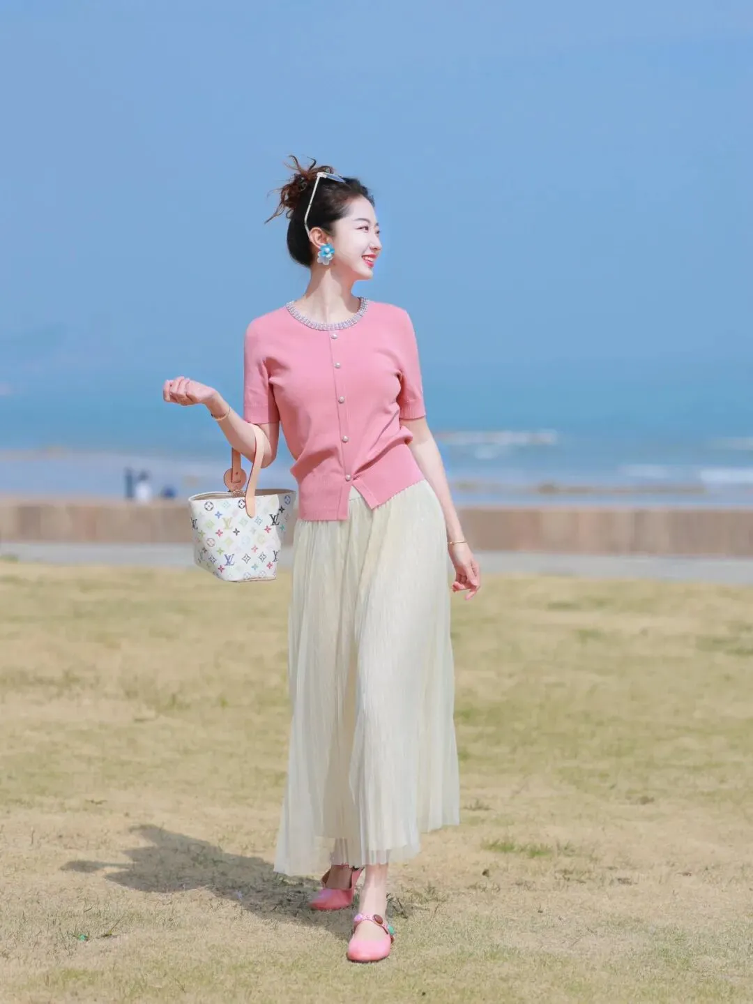 单手挎着包,墨镜搭在指尖,她没有看镜头,只是微笑着走向远方。那种从容和优雅,像是电影里的主角,每一个跨步都藏着风情。