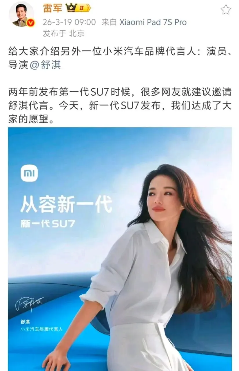 看新闻,舒淇最近成为小米汽车代言人。为她高兴,为她鼓掌。