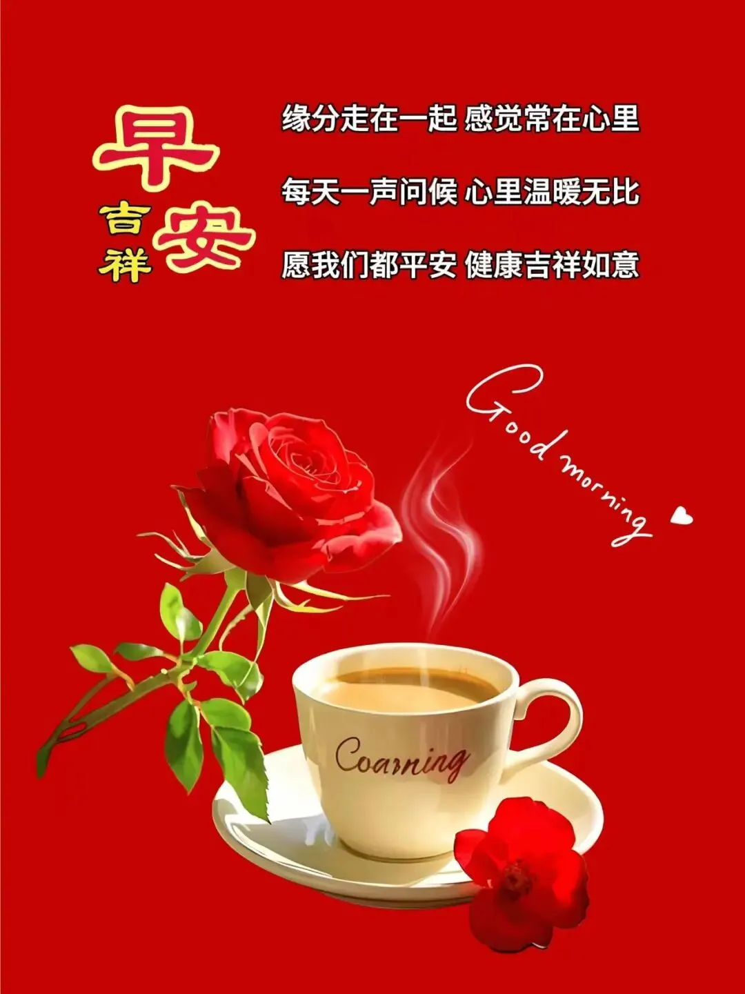 8、一天连一天,天天都平安;一月接一月,月月都快乐;一季接一季,季季都如意。愿我们永远健康快乐,幸福吉祥!早上好!