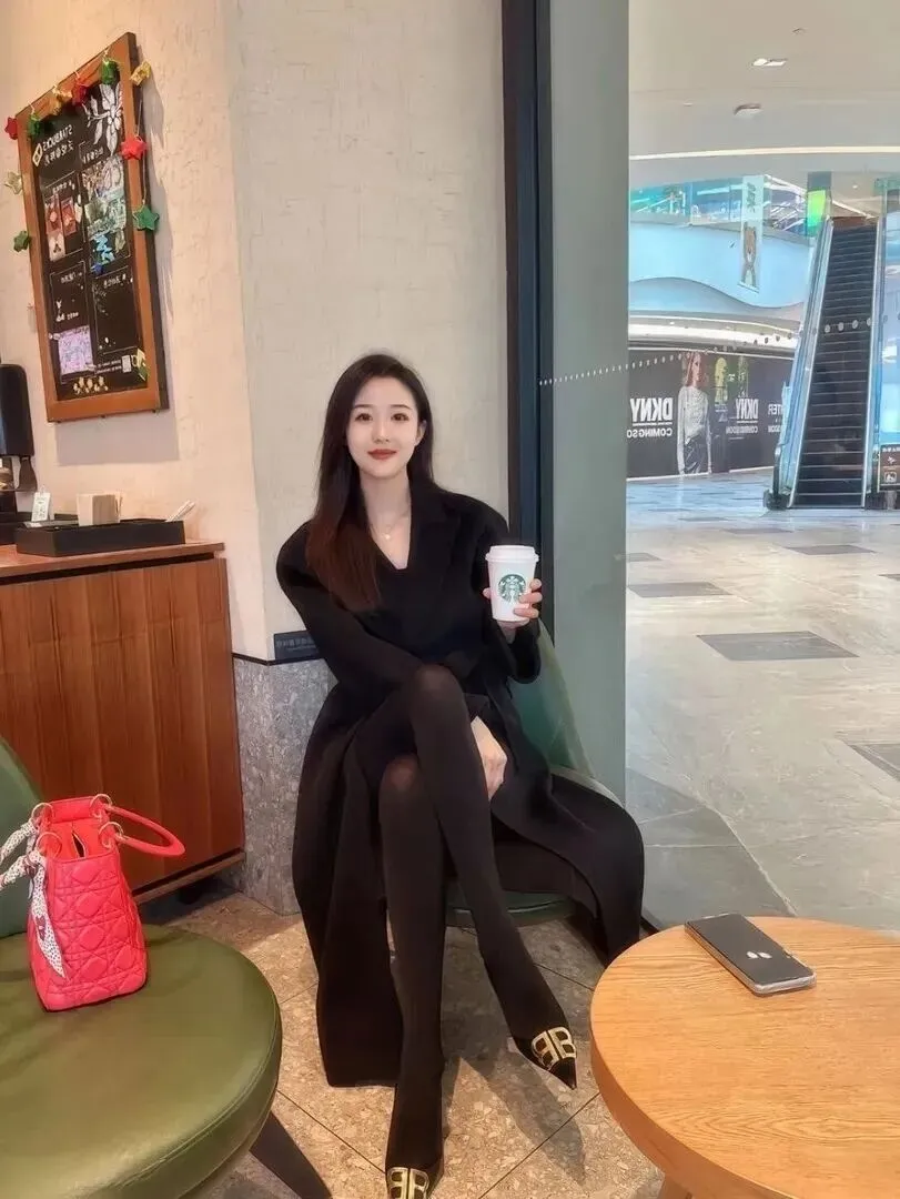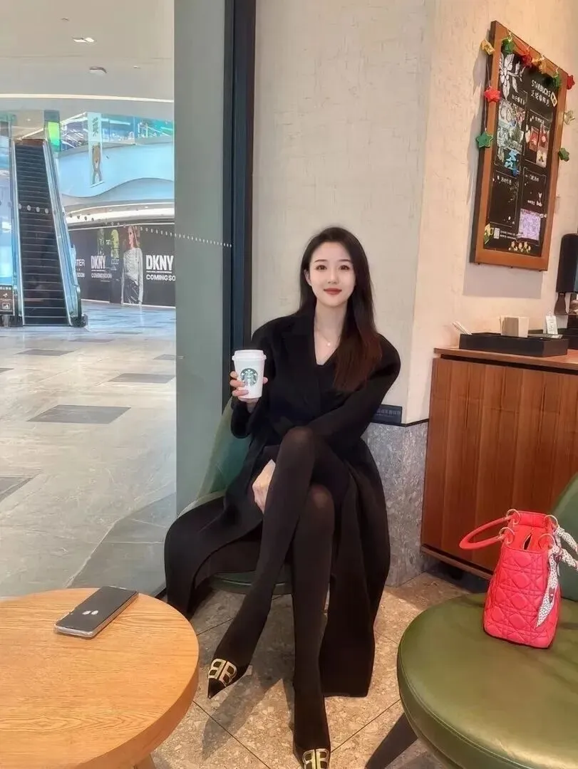 先看商场里这套。她穿着一件黑色的长大衣,版型非常挺括,但是摸起来应该很柔软,能很好地衬托出她的身材苗条、修长。最绝的要数那双黑色金配色的尖头鞋,金属扣子在灯光下一闪一闪的,全身黑里特别突出,把档次一下子提上来。穿黑色丝袜使腿更长,整个人就像多出了9头身比例。她手中拿着一杯星巴克,在商场中随意地站在那里,那份法式的自在自然也就显露了出来,完全没有刻意的痕迹。