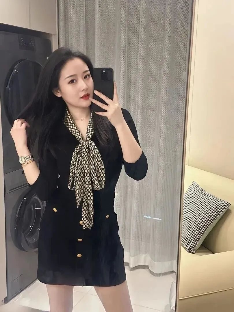 镜头拉远之后,整体表现裙子的修身状况。黑色多了一份复古感的黑白格纹丝巾成了焦点。依靠纱帘的光线柔和打到身上,有种温柔又高级的感觉。同一件衣服用不同的视角照相就会有新的发现,我们日常自拍也可以使用。
