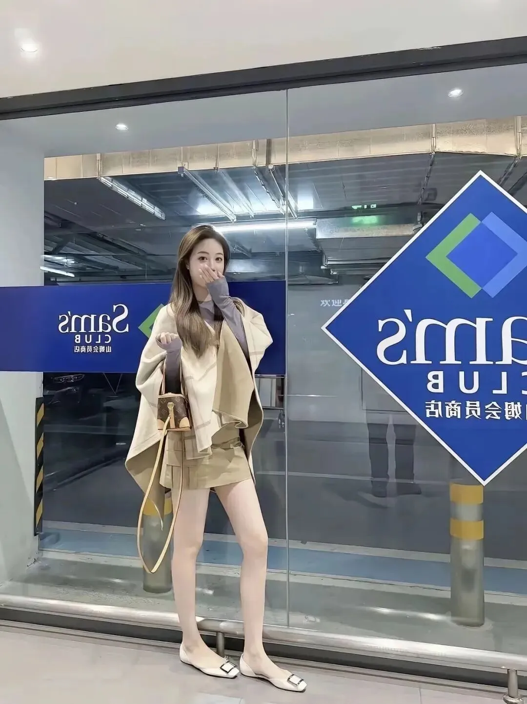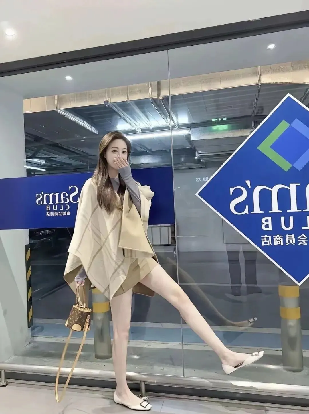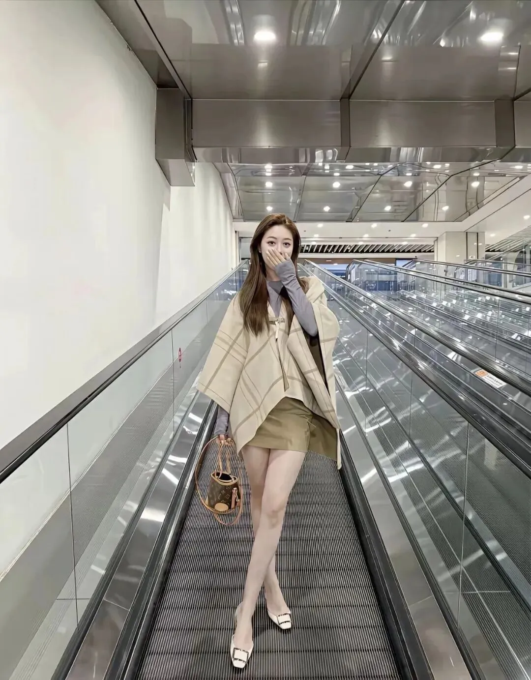 第二套仍然是以米白色为主,但是披肩的格纹比第一套更宽,带有一定的复古味。下装换成卡其绿色的超短裙,细微的色彩差别使整体有层次感。短裙属于高腰A字版型,具有拉腿长的特点,并且可以改善腿型。小姐姐手里拿着一个棕色的老花迷你水桶包,复古的气息一下子就被调动起来了。