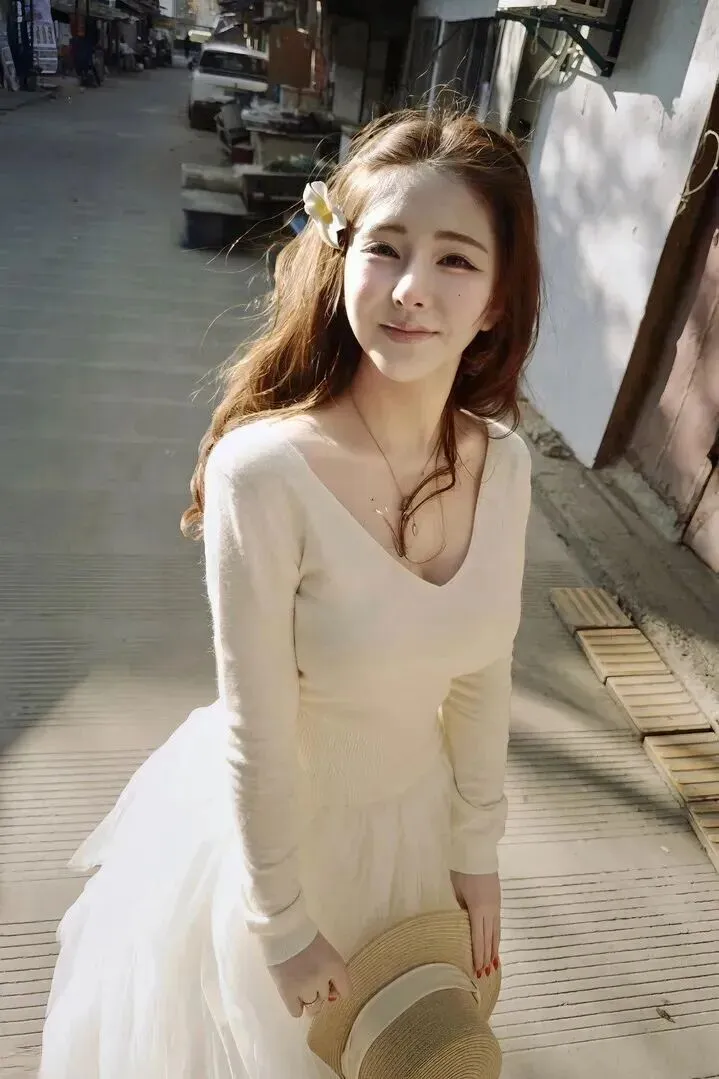 小细节往往最打动人。女孩头发里那朵小花,虽然不起眼,却让整体多了几分清新。她手里拿着帽子,身体曲线和裙子的蓬松感对比着,显得特别柔美。平时穿搭的时候,可以在这些小地方花点功夫。比如戴个精致的耳钉,或者别个可爱发卡,立马就不一样了。妆也不要太浓,淡淡的就好,看起来更自然。