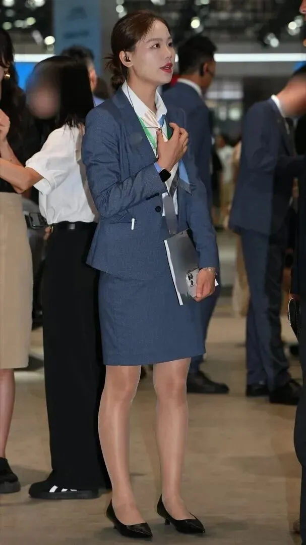 由此可见该套西装的剪裁特别好。收腰设计勾画出曲线,及膝直筒裙呈现出来的腿部曲线比较好。脚上穿的是亮面黑色单鞋,低跟鞋走路不累脚,尖头的款式又有时尚感。从整体上看干练有型,适合见客户、参加发布会。
