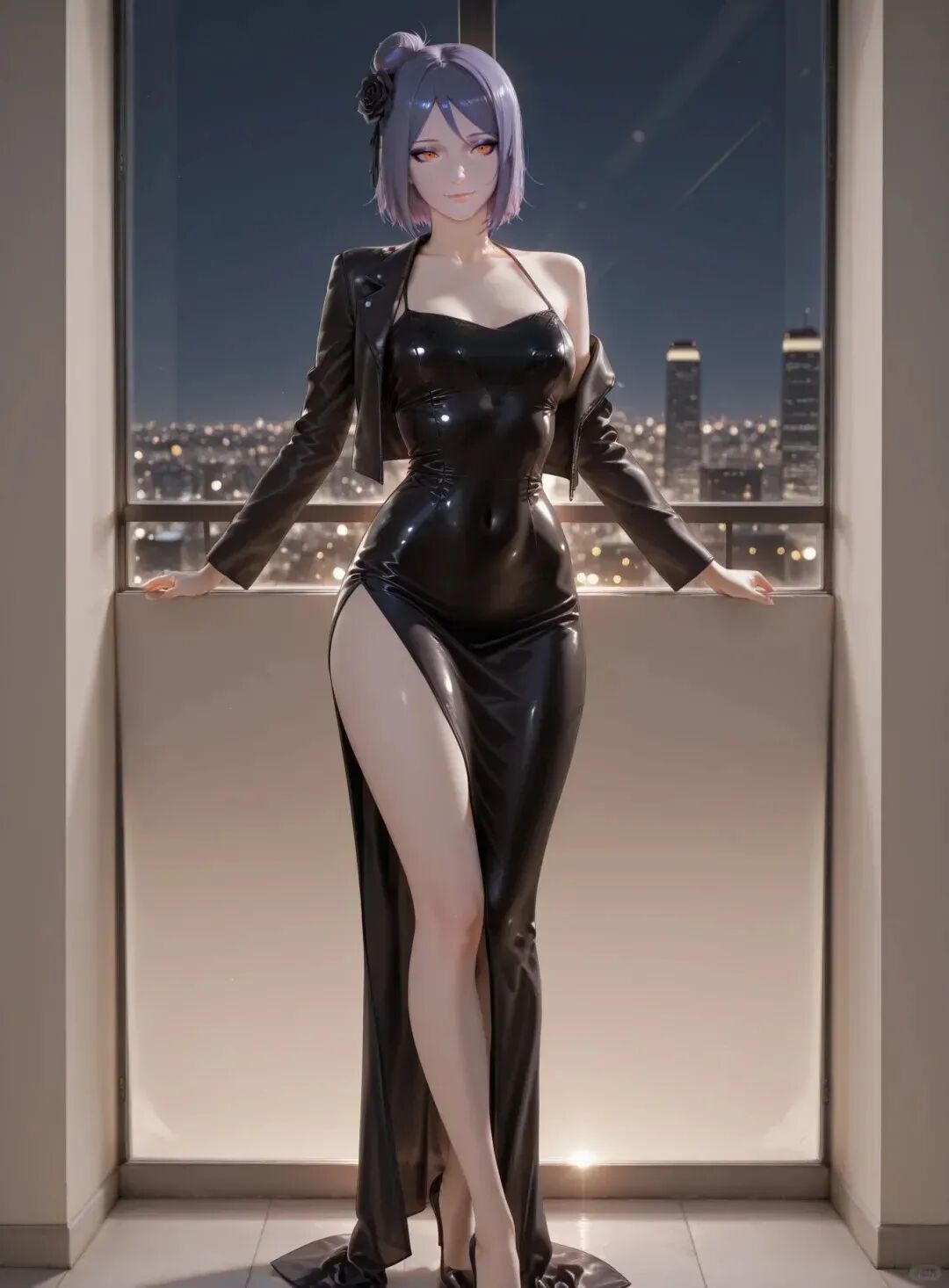 首当其冲的就是晓组织的温柔女神小南。紫灰色的短发精致挽成丸子头,发间别着一朵冷艳的黑玫瑰,标志性的温柔眼神里依旧藏着看淡世事的淡然。她静立在落地窗前,身后是城市的万家灯火,微微垂眼浅笑的模样,哪里还有半分纸遁忍者的影子,活脱脱一位刚结束豪门晚宴的千金小姐,冷艳疏离的气质拿捏得恰到好处,温柔与性感的完美平衡,这样的小南谁能不爱!