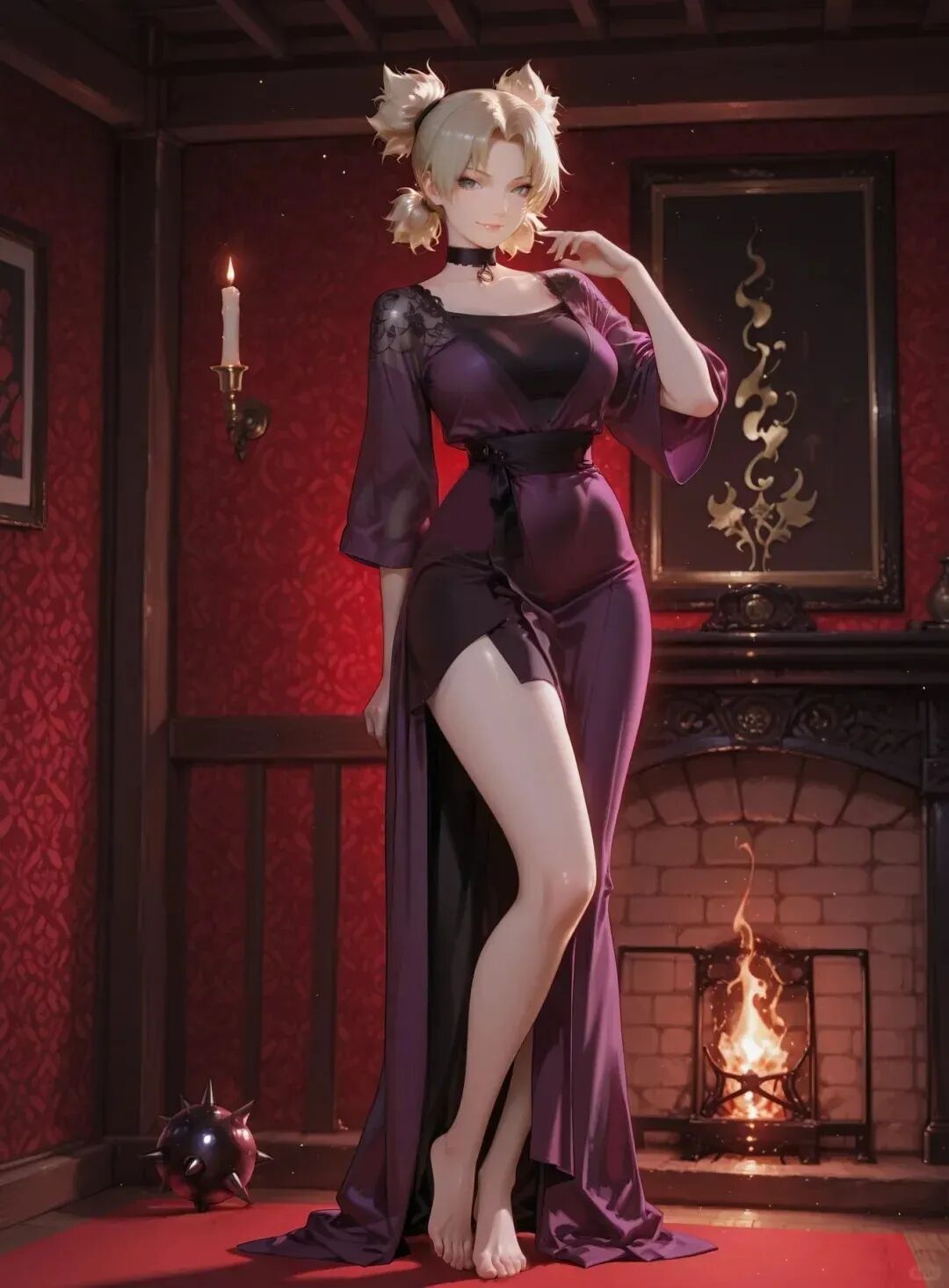 风遁女战士手鞠,双马尾的标志性造型依旧辨识度拉满,风格却来了个大转变。紫色丝绒睡裙拼接黑色蕾丝,温柔中带着一丝妩媚,颈间的黑色 choker 添了几分禁欲感。她站在暖融融的壁炉前,暖光轻洒在身上,连发丝都泛着温柔的光泽,赤脚踩在红地毯上,褪去了忍者的凌厉,多了几分慵懒娇媚。身后的火焰跃动,与她炽热勾人的眼神相互映衬,这份独特的魅力,让人根本扛不住!