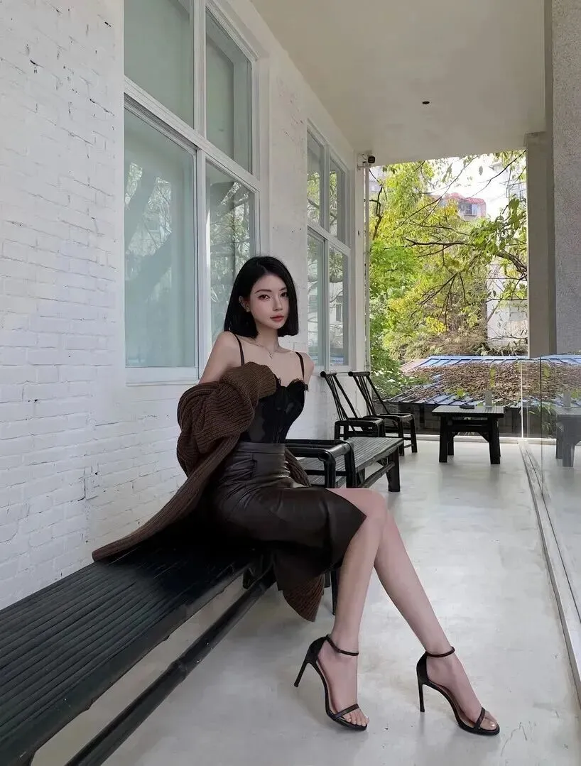 回到户外走廊,又穿出了新的变化。黑色皮质的吊带抹胸,配同色系深棕色开衫,这次裙子换成的是深灰色哑光皮质款。她站在那儿,左手扶腰身,自在自然。开衫竖条纹特别显瘦,抹胸收腰使身材比例看上去更修长。裙子的开叉、黑色细高跟凉鞋与之相呼应,整体有了几分锐气。这套搭配给人感觉就是我不用去讨好任何人,只要我愿意去做自己就最完美。