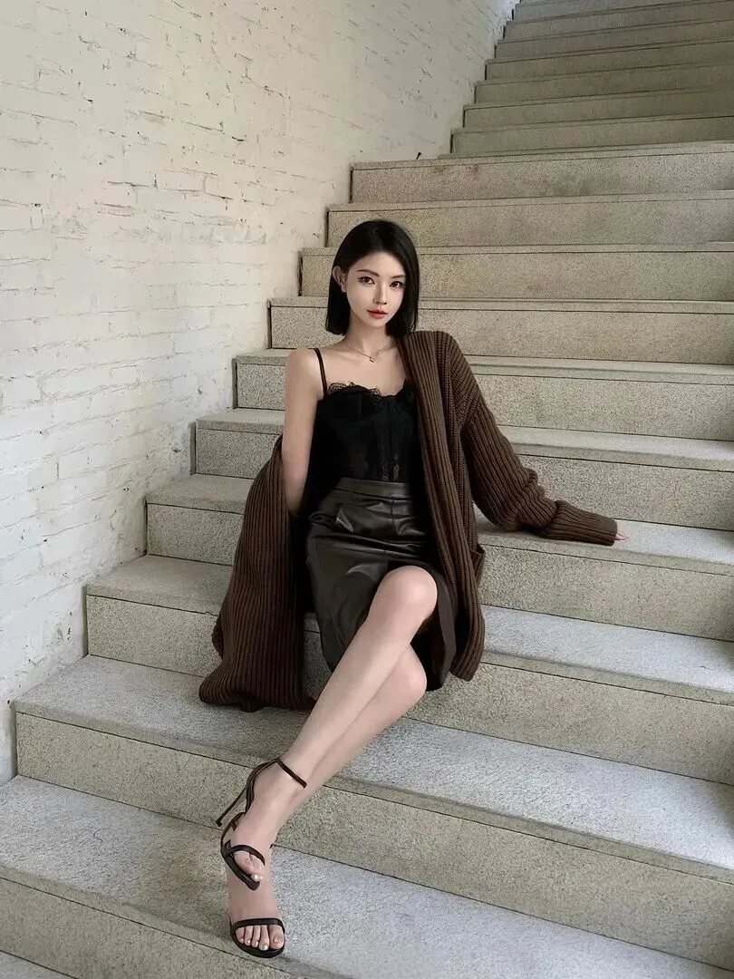 楼梯台阶上这一件,黑色蕾丝拼接吊带胸衣外穿深棕色开衫,下身是深棕色哑光皮质半身裙。她的左侧头发被她左不自觉地理成了一样自然的“抓拍”头发一样。裙子有明显的褶皱,黑色细带凉鞋,朴实无华的室内色调中灰色楼梯的氛围更加冷冽高雅。简约并不等于简单,每一件单品都有它存在的意义,组合起来就是和谐的美。