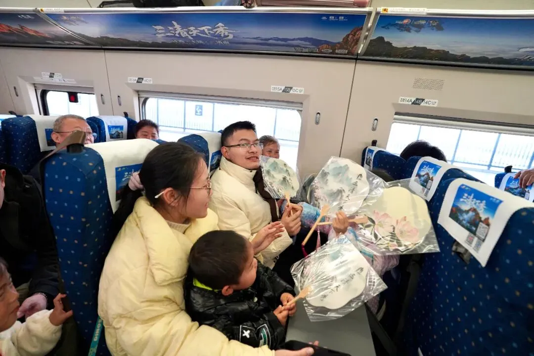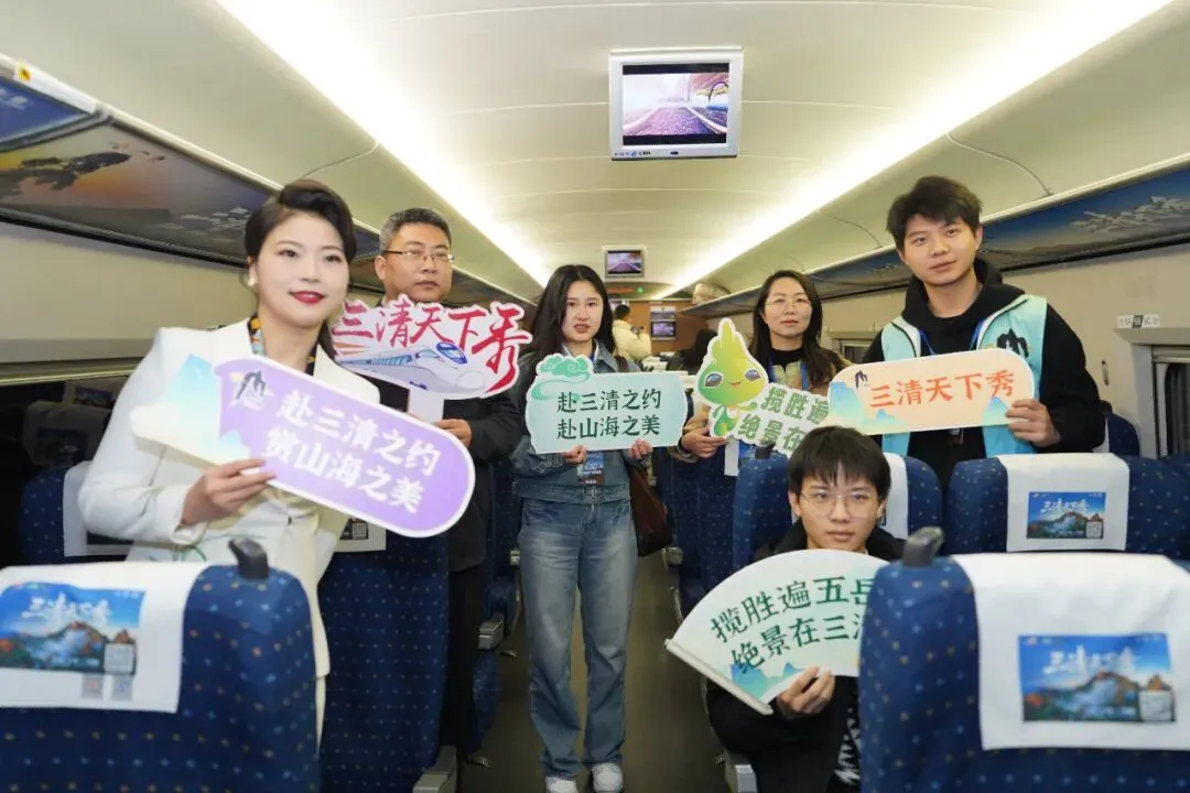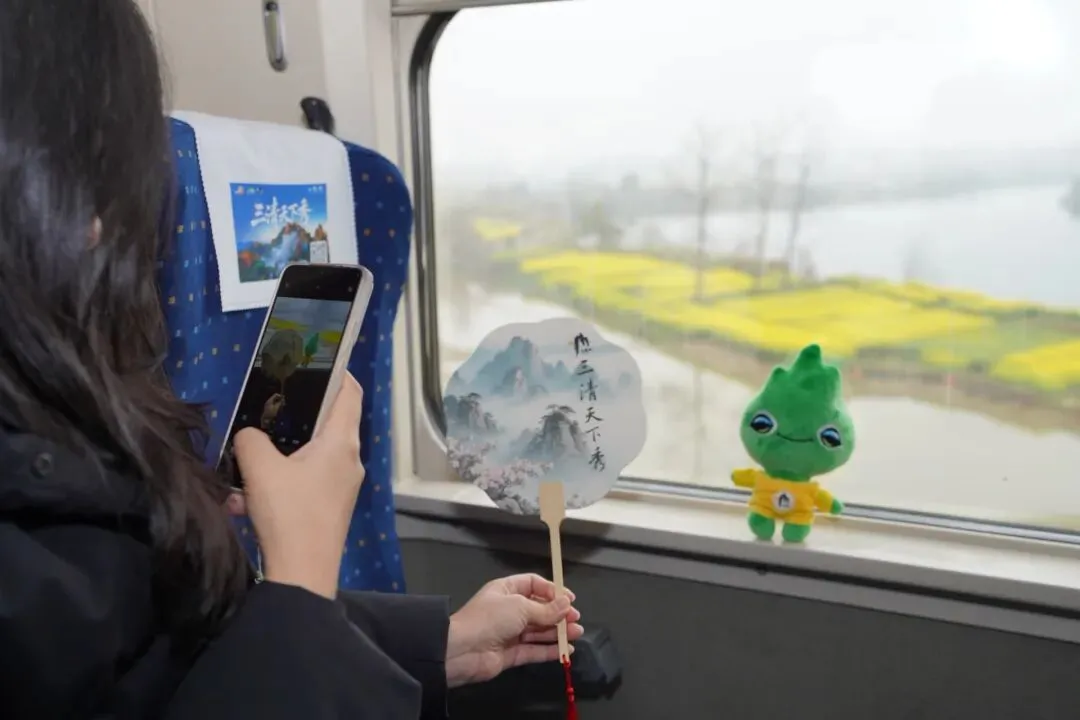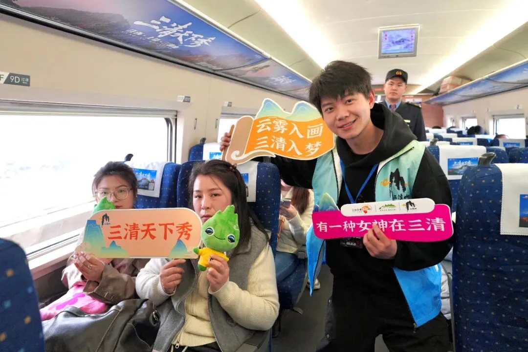 3月21日首班当天,三清山文旅推介官登上女神专列,在车厢内与游客温馨