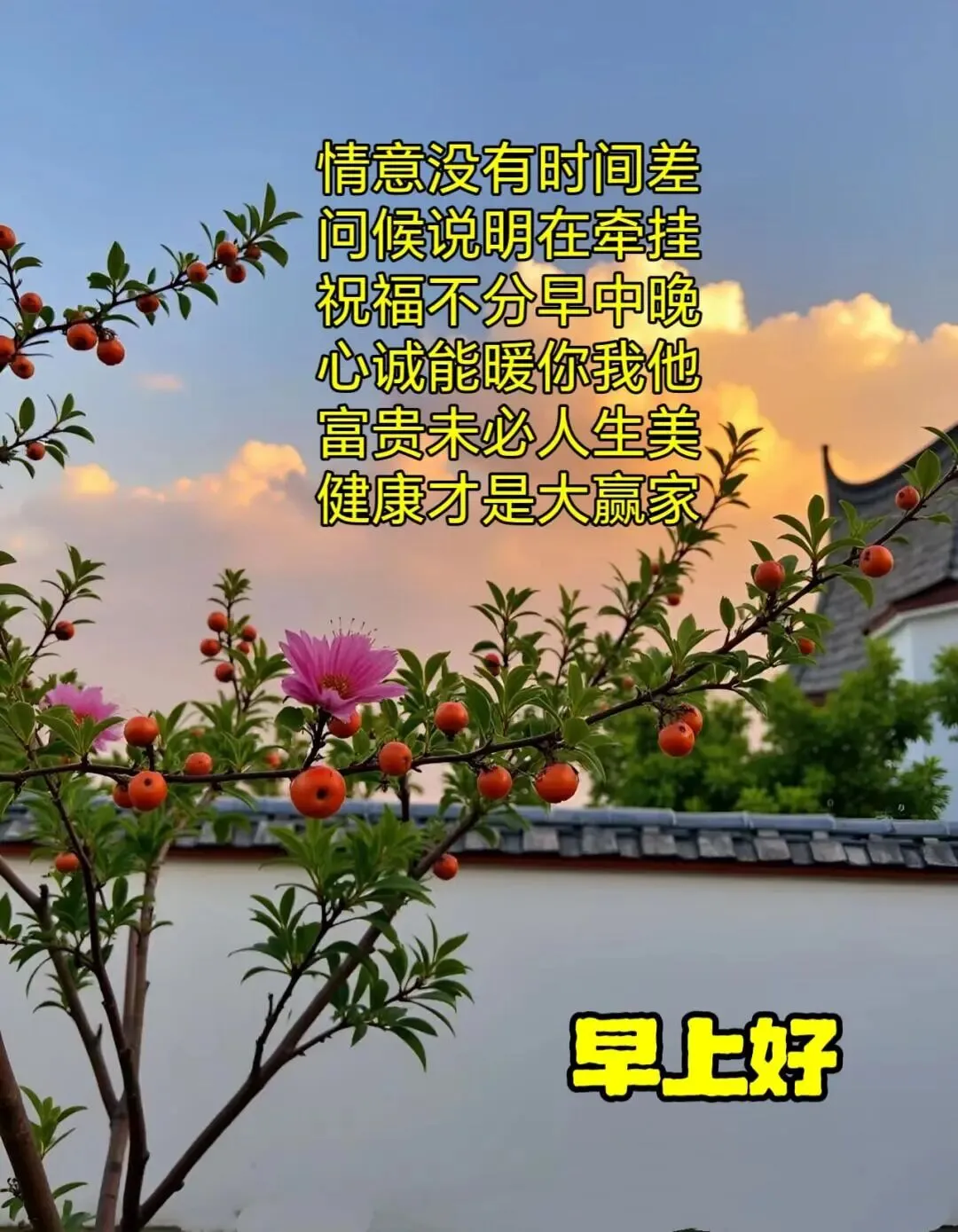 晨光为笔绘吉祥,玉露晶莹缀梦乡;金风携暖拂眉梢,步履轻踏云路长;心若朝阳常绽笑,安康福满岁岁香。早上好!🌹🍎☀️❤️☕️🎉