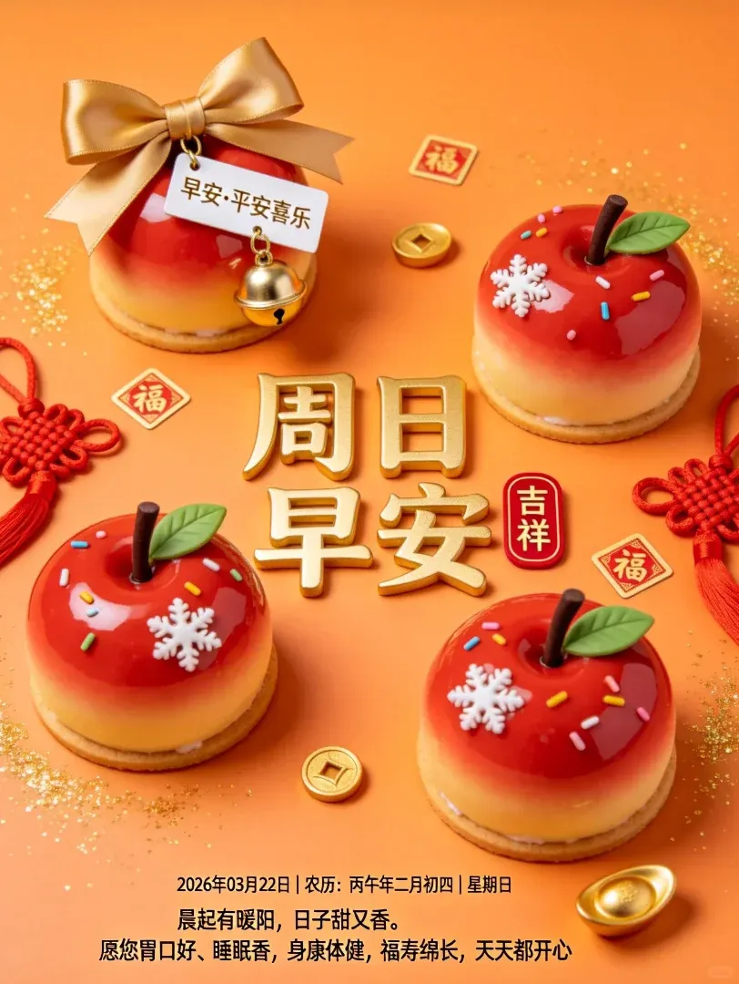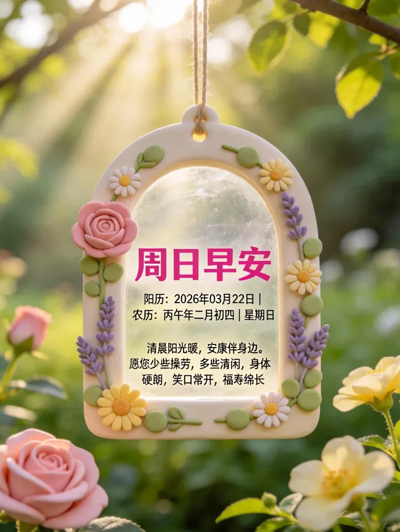 1. ☀️早安!今天是2026年3月22日,温柔的周日。不用赶早、不用匆忙,好好享受这难得的悠闲时光。放下一周的疲惫,清空心里的烦躁,放慢脚步,好好拥抱自己。愿你身心轻松,笑容温柔,日子清净安稳,平安喜乐,周末舒心自在。