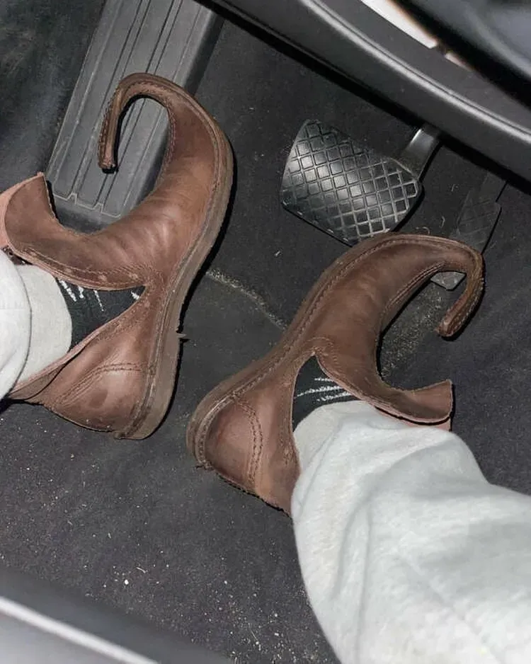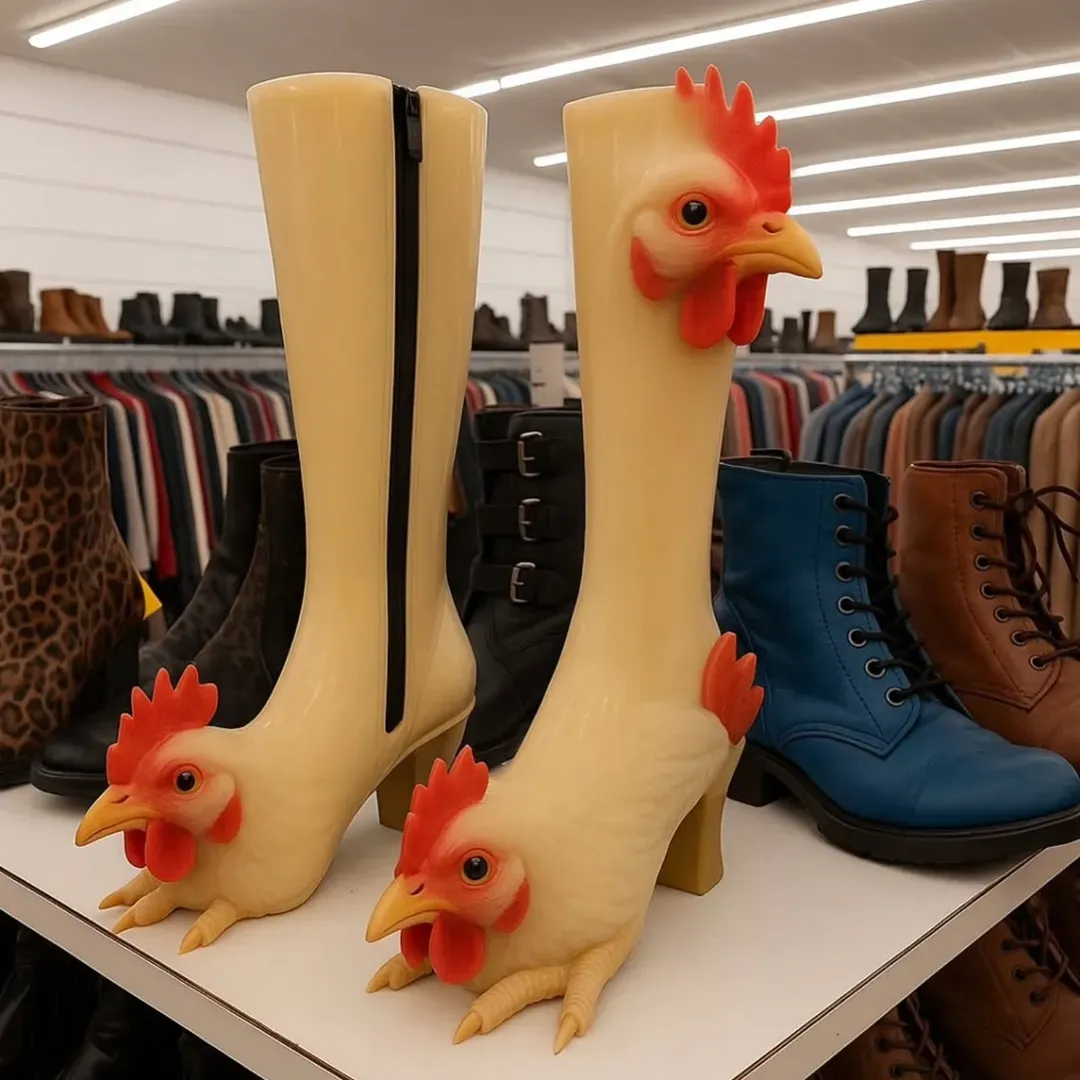 我们可以看到,身着牛仔裤,跪姿人体下半身造型的花盆;视觉上就像出了疹子、长了痘痘的美甲;以及拥有鸡头造型的长筒橡胶靴。给人一种古怪、荒诞、甚至完全缺乏实用性的感觉。