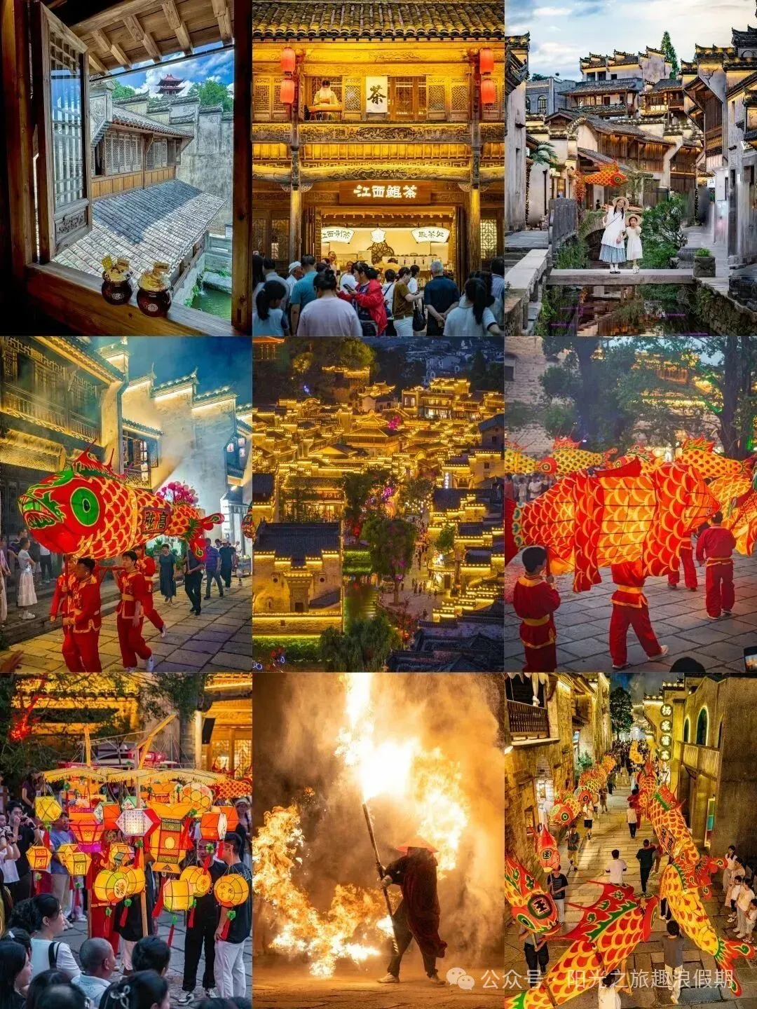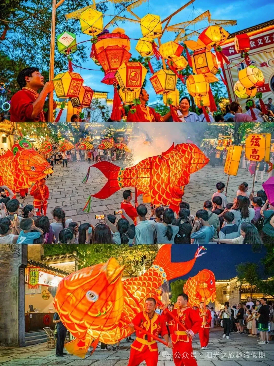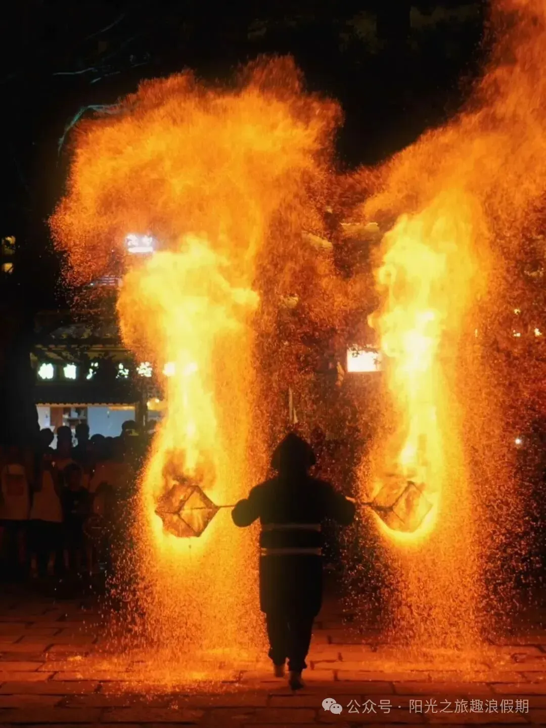入夜·鱼灯点燃千年梦境鱼灯起灯➕巡游:桂花灯、鳙鱼灯、鲤鱼灯……数条巨鱼驮星河游过街巷,一起感受「一夜鱼龙舞」的震撼火焰x民乐!冰火两重天! 火壶冲天超震撼!火刀飞舞似流星!但配上潺潺古乐… 神奇!燥热被“滋啦”浇灭!