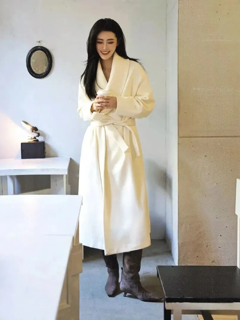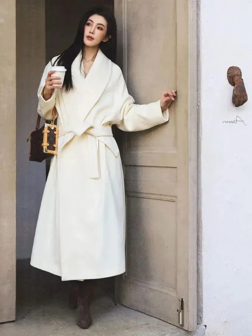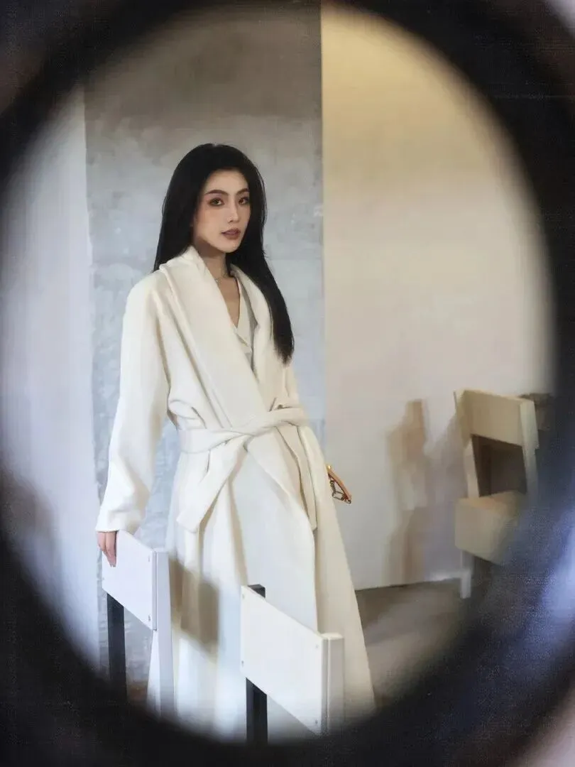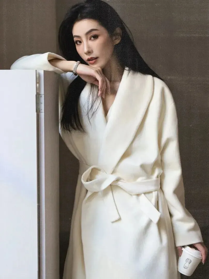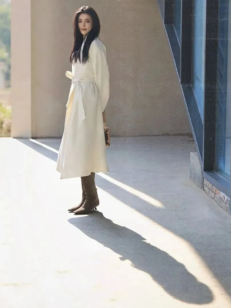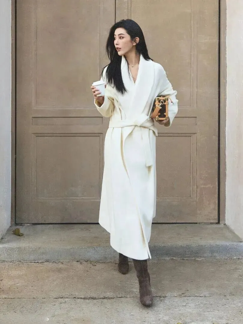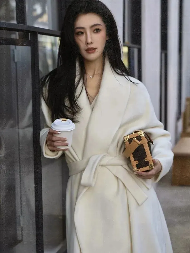 上班族怎样穿搭?这件浴袍式羊毛大衣的垂感很好,长度到达脚踝处,气场全开。背着复古手包走在双开门前面的时候,通勤路也能成为精致满分的好时光。