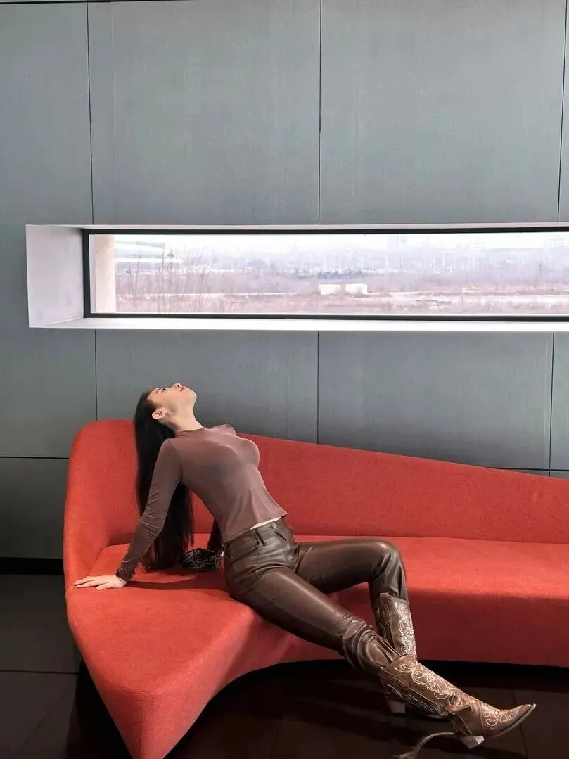 她倚靠着复古橘红色的沙发上,整个人很放松、很自在地蜷缩着。浅棕色紧身长袖衫随身形微服贴身,弹力面料有光泽,皮肤更加白皙。下半身为黑色的长袖毛皮马裤,两腿笔直并置,上面绣有白色的绣纹,具有西部特有的气质。整体色调暖暖的,橘红和棕咖交叉使用,有很强的舒适感但不简陋!最适合在家里周末泡上一杯咖啡,舒服又精致!