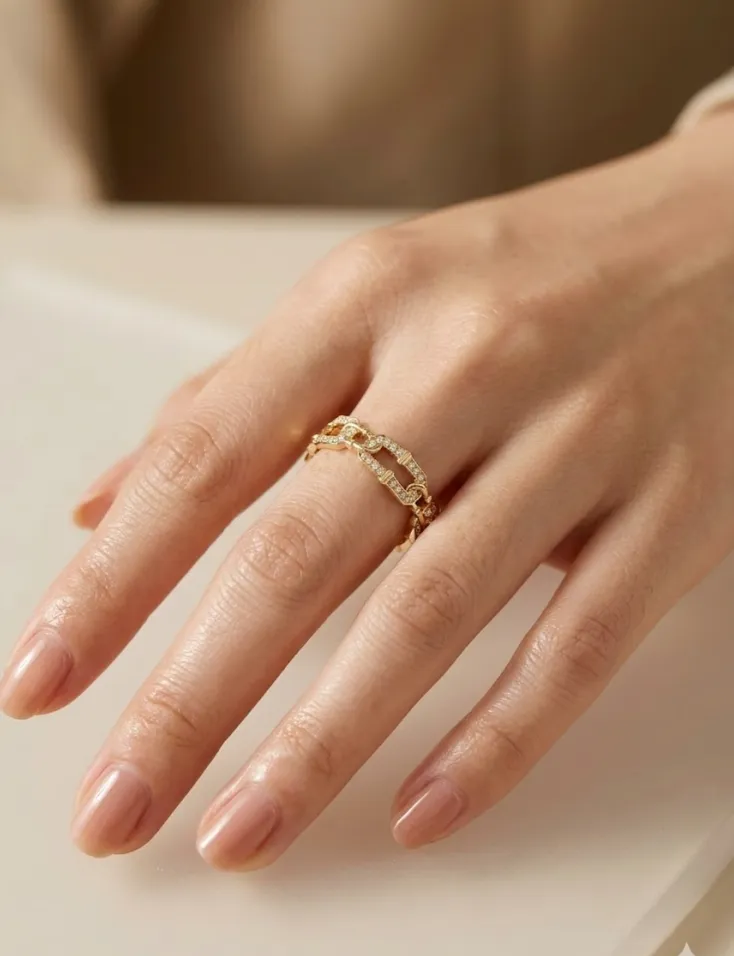 一张高清商业摄影风格照片,亚洲女性纤细的手部特写,手指上佩戴图中的一枚18K金镶嵌钻石的戒指,戒指设计简约精致。自然柔和的侧光照射,背景为浅米色磨砂质感,画面干净高级。手部皮肤细腻有光泽,指甲做了裸粉色美甲。浅景深,突出戒指细节,8K画质,商业珠宝广告风格