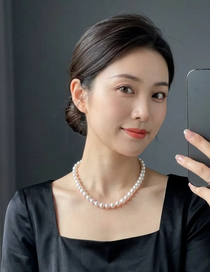 一张自然自拍风格的半身人像摄影,亚洲女性佩戴图中的一串经典的白色伴一点粉色光晕的海水珍珠项链,珍珠大小均匀圆润有光泽。模特穿着黑色方领丝绸连衣裙,头发盘起露出脖颈线条,妆容精致优雅。自然光线,背景为深灰色渐变,画面高级大气但柔和自然。珍珠表面反射柔和的光芒,质感真实细腻,4k高清。
