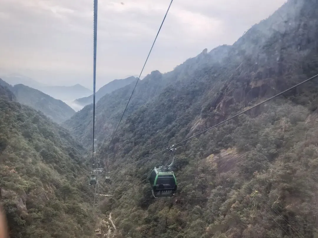 从下车点到索道站,大概二十分钟路程。路边卖拐棍的、上饶鸡腿的、水果摊、泡脚店……热闹非凡。我们一路闲聊,很快就到了索道站。缆车里就我和小燕子,这次我居然一点都不恐高,看着窗外烟雾缭绕的山峰越来越高,心情激动得像要飞起来。