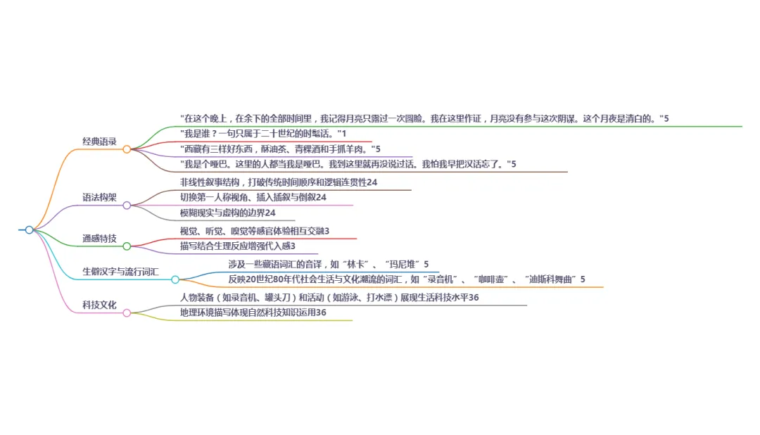 ■ "雪水触感像铁器"(《喜马拉雅古歌》)  ● 通感机制:    温感(雪水冷)→ 材质感(铁器硬)→ 听觉隐含(金属撞击声)    高原物理体验 → 抽象权力隐喻(藏刀/锁链意象)  ■ "羊毛被的膻味是暖黄色"(《虚构》)  ● 跨感官映射:    嗅觉(膻)→ 色温感知(暖黄)→ 触觉记忆(沉重覆盖感)    病理学暗示:麻风病导致的感官错位(医学人文注析)
