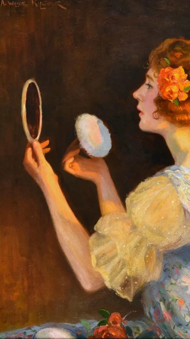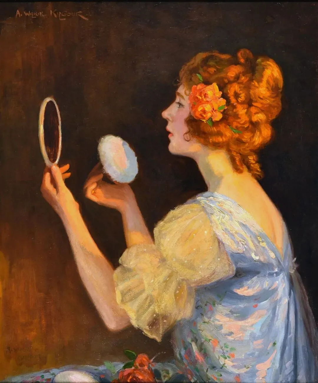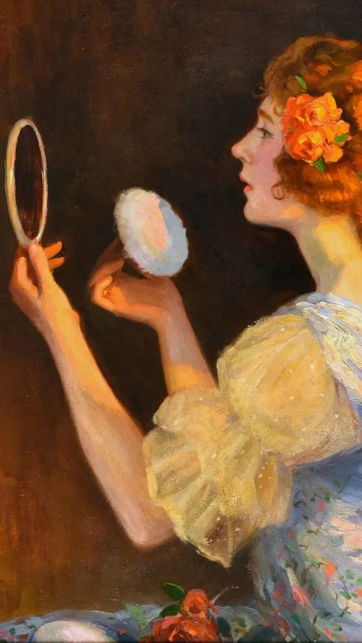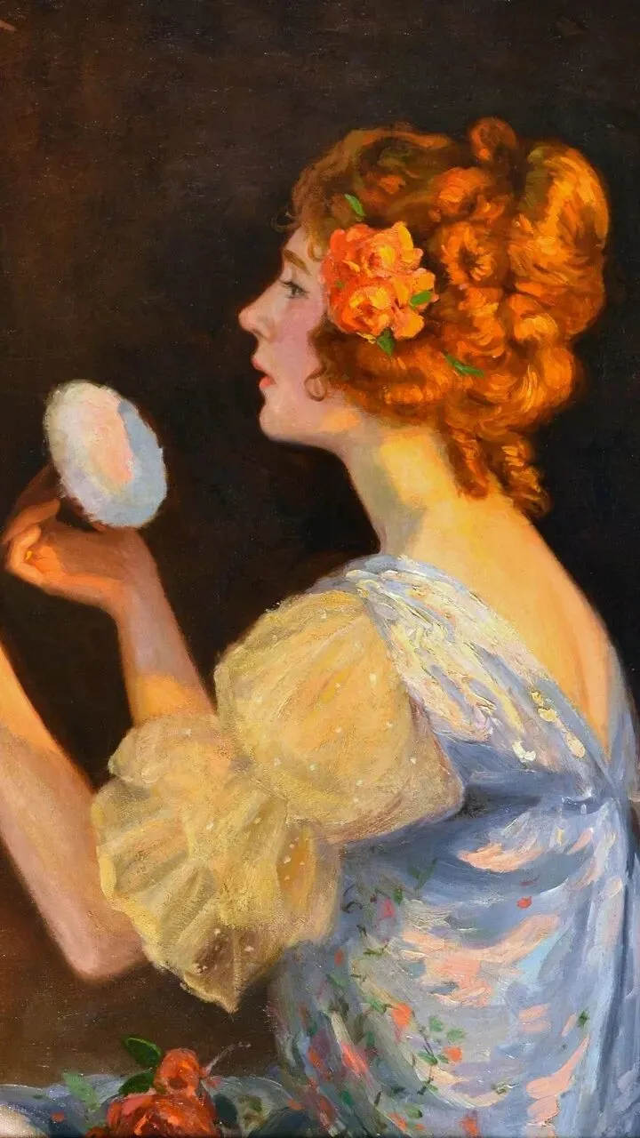 画面中心是一位侧身而立的红发女子,她正专注地对着一面精巧的圆镜审视妆容,右手轻拈粉扑,指尖流露出一种漫不经心的优雅。