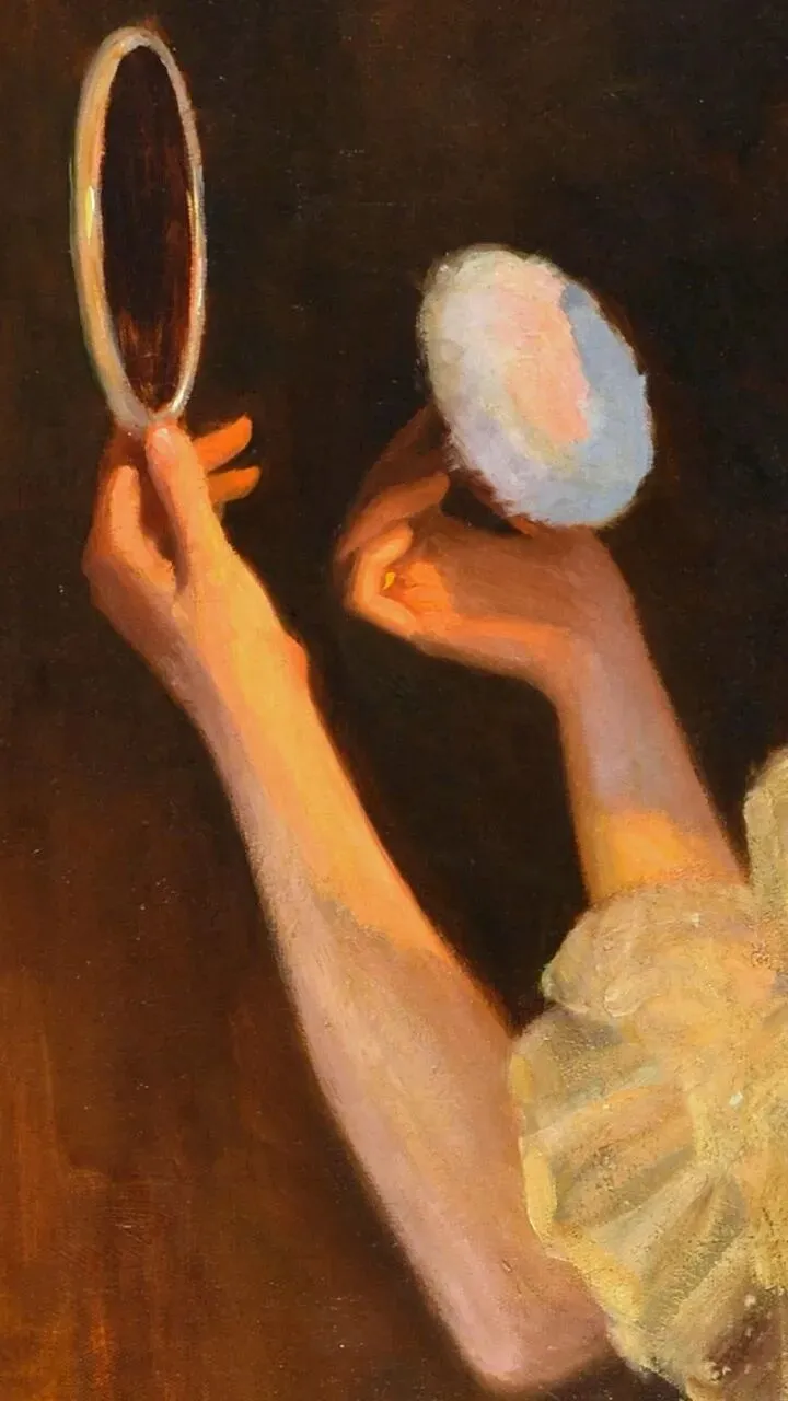 他用手中的画笔记录下这种行将消失的优雅,将一个平凡的梳妆瞬间凝固成永恒。画面的构图重心微向左偏移,女子的手镜与粉扑形成了一道隐形的张力线,将观众的视线引向那面小巧的镜子,镜子虽然没有映射出具体的影像,却象征着女性对自我的观照与审视。