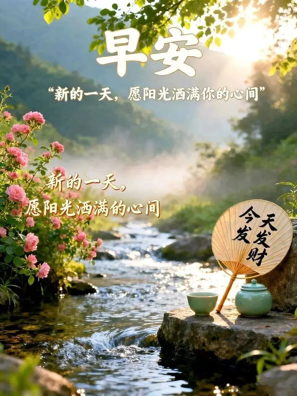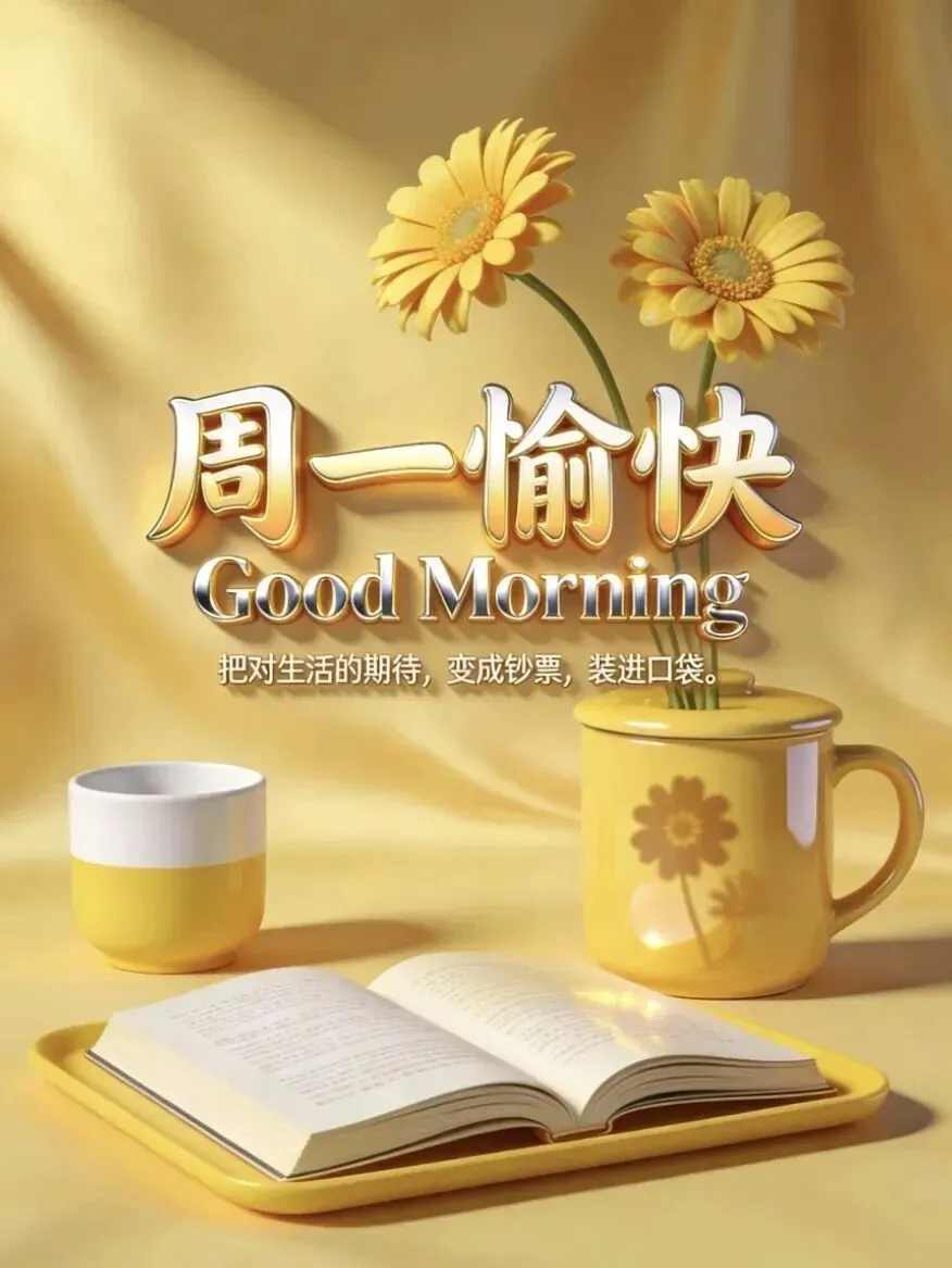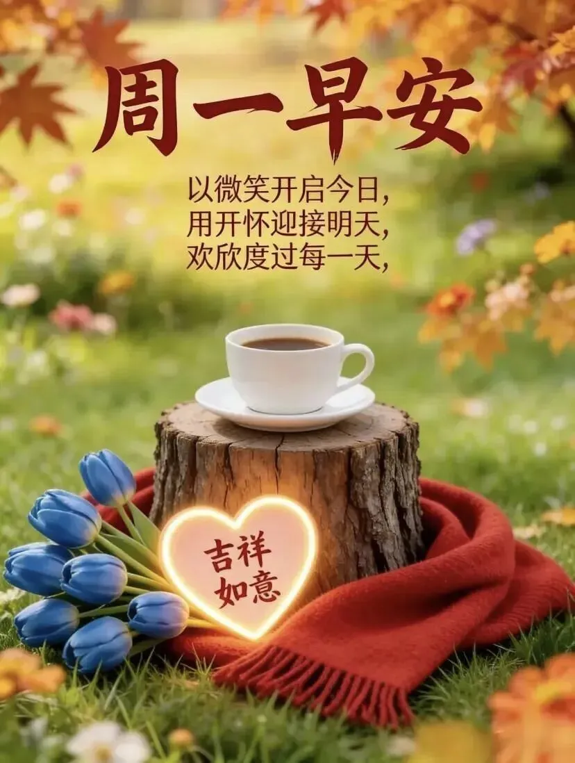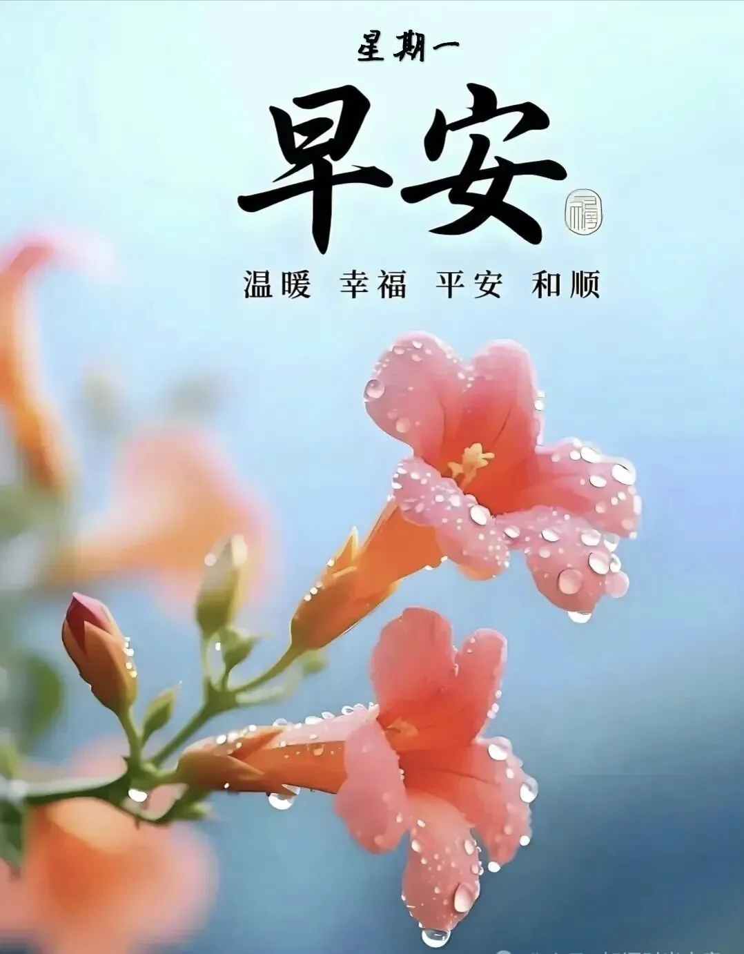 4. 新周第一缕晨光,是给你的专属好运符✨!周一清晨的风携着清甜🍃,吹散所有烦扰,给你满格能量🔋、稳稳福气🍀,职场遇机遇💼,生活有欢喜🏮,三餐暖、四季安,周一早安,顺遂无忧🍵!