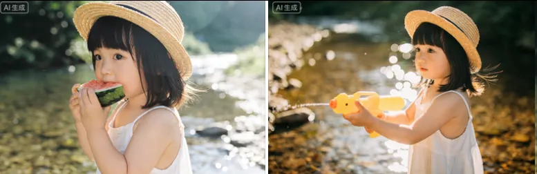 帮我生成xx张图片:保持人物五官长相不变,胶片感写真,穿白色吊带连衣裙的小女孩,齐刘海齐肩发,戴草帽,侧逆光,微风,溪水边,人物头身比例符合3岁女孩,有眼神光,背景有光斑,模仿滨田英明,远景拍摄。人物动作分别为吃西瓜,玩黄色小水枪,玩黄色小洒水壶,玩水,原比例。