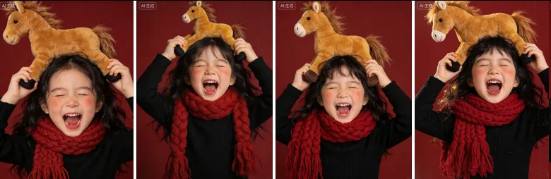生成xx张不同姿态的近景图片:3岁的小女孩,要求脸部特征:脸型、五官、头型必须严格保持一致,眼神清澈去除原配饰和原背景。采用平视拍摄角度与上半身近景景别,画面中心是东亚小女孩,背景是纯深红色哑光质感的平面,整体为融合国风民俗的治愈系童趣新年风格,带轻微的细腻胶片颗粒感。画面主体是身着黑色长袖针织上衣的孩童,衣物质地呈现细密的针织纹理;脖颈处缠绕厚实的正红色麻花编织粗线围巾,围巾蓬松柔软且有自然的垂坠褶皱,红色在黑色上衣衬托下极具视觉张力。孩童留蓬松柔软黑色长发,发梢蓬松凌乱带自然毛躁感,发丝边缘在光线下有柔和光泽;面部为自然童趣妆,双颊晕染出原生感红晕,无其他妆饰,孩童双眼紧闭、嘴巴大张露齿,呈现出夸张又活泼的大笑/呐喊表情及其他有趣可爱的表情。道具为棕黄色毛绒小马玩偶,玩偶毛发是短绒与长绒拼接,鬃毛呈立体蓬松的立起状态,被孩童双手举在头顶位置,左手抓玩偶左侧腿部,右手抓右侧腿部,玩偶整体覆盖孩童头顶区域