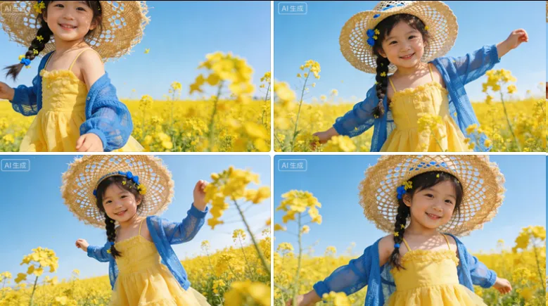 严格保留五官不变去掉原图背景,生成一位3岁女孩站在盛开的油菜花田中的景象。她身穿黄色吊带公主裙外面套着蓝色薄针织外套,头发编成一条韩式风格辫子,带着简单的拍照专用的镂空大帽檐编织草帽,帽子上方有蓝色戴装饰,她面带微笑,头发上点缀一点点油菜花,显得心情愉快。背景是广阔的油菜花田天空呈现清澈的蓝色,与油菜花的黄色形成鲜的气明对比。整个画面色彩鲜明,充满了春天息。构图虚实结合且有强烈的视觉冲击,有前景构图。超广角摄影角度有创造力不撞款不普通。态充满生命力与活力,女生姿势优雅多变有动变,生感抓拍,5种姿势。人物表情肢体动作,生成xx张不同姿态的图片,