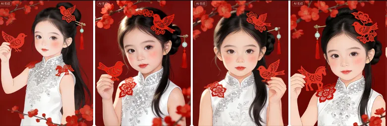 生成xx张符合生成一位3岁女孩不同姿势动作的新照片,外貌五官头型不变,去除所有配饰服饰及背景,新图片女孩长发被精心打理,一侧盘成温婉发髻,搭配带有玉饰、红流苏的古典发簪,另一侧发丝自然垂落,头顶还装饰着红色剪纸风格的花鸟发饰,精致又充满传统韵味。服饰选择了一件白色无袖旗袍,领口和衣身布满银白亮片与刺绣纹样,绣工细腻,妆容清透又富有东方美感,眉眼精致,脸颊带着自然红晕,唇色柔和,与整体造型相得益彰;手拿着一枚红色剪纸小鸟装饰,与头上、肩上的剪纸元素相呼应。背景是饱和度适中的深红色,既衬出人物的清新感,又烘托出喜庆、典雅的氛围。前景和上方点缀着红色花枝,花朵鲜艳饱满,与剪纸元素、服饰细节相互呼应,营造出层次丰富的视觉效果。 光线柔和均匀,在发丝、旗袍亮片以及皮肤表面形成细腻高光,让画面质感显得格外高级,整体传递出温婉、精致且充满传统年味的情绪。画质超高清,比例3:4