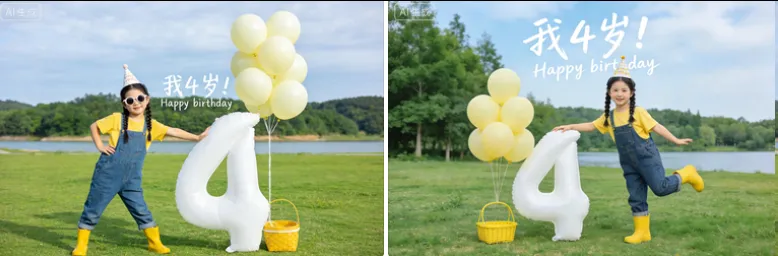 豆包帮我生成xx张不同户外搞笑姿势图片,户外草坪九岁女孩生日写真,清新治愈风格。画面中心是精致的麻花辫子,戴白色圆框墨镜和和不戴墨镜,小生日帽的小女孩子,身穿黄色t恤+牛仔背带裤,脚踩黄色雨靴,右手轻扶一个巨大的白色数字“4气球道具。她身旁立着一束淡黄色气球,下方有黄色小篮子。背景是开阔的绿色草坪、远处的湖泊与葱郁树林,天空淡蓝带薄云。画面叠加手写体文字“我4岁!”和英文“Happy birthday”,整体色调明亮柔和,充满童真与春日氛围感。原比例。