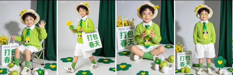 口令:8K分辨率,xx张清新童趣春日儿童写真组图,主体为一名可爱小男孩。身穿鲜亮果绿色绞花针织毛衣,内搭白色翻领衬衫,下装是宽松白色短裤,搭配绿色中筒袜和带彩色条纹的白色休闲鞋。佩戴一条绿黄渐变的卡通小狗图案领带,头戴一顶浅米色草编宽檐帽,帽檐上装饰着黄色仿真小花。妆容清新童趣,脸颊上点缀着黄绿色的小花与圆点图案。发型是自然蓬松的短卷发。 背景为浅灰色墙面,右侧搭配深绿色的垂坠幕布。地面散落着绿底黄心的布艺花朵。道具包括一个印有绿色“打包春天”与英文“PACK SPRING”字样的白色手提纸袋、一束黄色仿真花、几个青苹果、一个绿色花朵手持道具、白色仿真耳机等春日主题道具。 人物动作丰富多样:1. 坐在折叠椅上开心挥手;2. 侧身提着纸袋行走;3. 盘腿坐在地上,双手举起一个青苹果;4. 戴着白色耳机微笑;5. 趴卧在地上,凑近闻一个青苹果。 采用影室灯光,将柔和硬光与柔光结合,在墙面和地面形成清晰的明暗层次。整体色调明快鲜亮,高清晰度,色彩还原准确,完美呈现天真烂漫的春日活力氛围。比例 3:4。