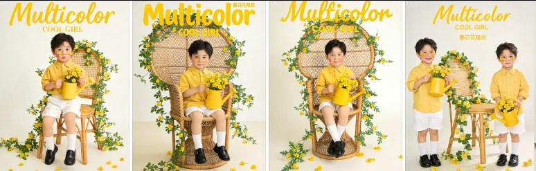 指令来了以图中小男孩人物为原型,生成xx张春日儿童写真。呈现出不同表情和动作。米白色背景,自然光线,营造明亮通透的氛围。藤编高脚椅缠绕茂盛的绿色藤蔓,藤蔓间有黄色迎春花点缀,模拟自然生长的花架效果,地面随意散落黄色花朵。身穿黄色衬衣搭配白色短裤,脚穿黑色小皮鞋与白色中筒袜;手拿插满黄花的黄色浇水壶。面部妆容以“春日花精灵”为主题:略微腮红,眼下贴一排黄色花朵装饰,鼻尖点缀亮片。光线明亮柔和,整体以黄白色系营造童真自然的春日氛围,画面上方添加大大的黄色手写体“Multicolor”作为主标题,COOL GIRL为副标题,风格活泼可爱、充满生机。原比例