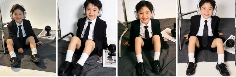 帮我生成xx张不同表情,不同动作的照片,人物主体:小男孩,穿黑色西装外套+白衬衫+黑领带+黑短裤+白袜+黑皮鞋,戴银灰色头戴式耳机,坐姿活泼,面带微笑看向镜头。场景布置:深灰色布料铺底,右侧放置一本杂志与黑色球形摆件,左侧有银色金属扶手,背景为白色墙面。
