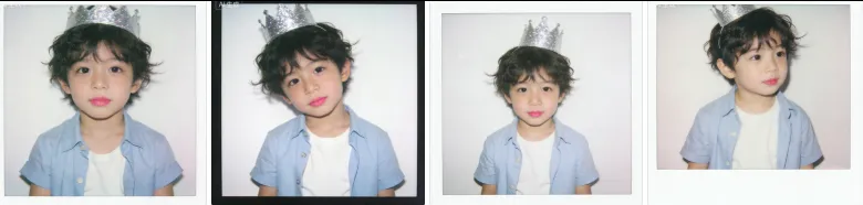 口令:复古的富士相机拍立得,过曝的胶片美学,拍立得尺寸,照片充满了独特的胶片颗粒细噪质感,画面色彩饱和度低,带有拍立得特有的色彩倾向。白色的拍立得相纸边框,简单背景,空白背景,近景特写,浅景深,焦外柔和虚化,年轻甜美的东亚6岁男童,自然卷短发,发丝微乱,少许发丝像微风吹过,灵动治愈的生动神态,原生无妆感妆容,淡粉色唇膏,皮肤细腻通透有自然光泽,头戴银色小亮片装饰的皇冠造型生日帽,外穿浅蓝色短袖衬衫扣子全打开,内穿白色t恤柔和漫射室内自然光,治愈系的生日氛围感,少年感拉满,画面带点虚焦感,皮肤带着细噪颗粒感。