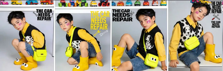 口令:帮我生成xx张小男孩图片:浅灰纯色背景,男孩侧瞟镜头或者直视镜头,各种神态动作,桌面与头顶摆放彩色玩具车,表情酷帅,布灵布灵舞台妆,脸颊贴粉色卡通贴纸,内搭黄衬衫外穿黑斑点狗背心,下身酷酷牛仔短裤+黄色卡通眼睛雨靴,斜挎亮黄小包,搭配“THE CAR NEEDS REPAIR”英文标语与工具图标,氛围俏皮童真,杂志风,潮流街头风活力满满,比例3:4