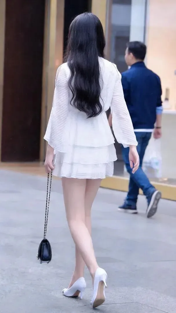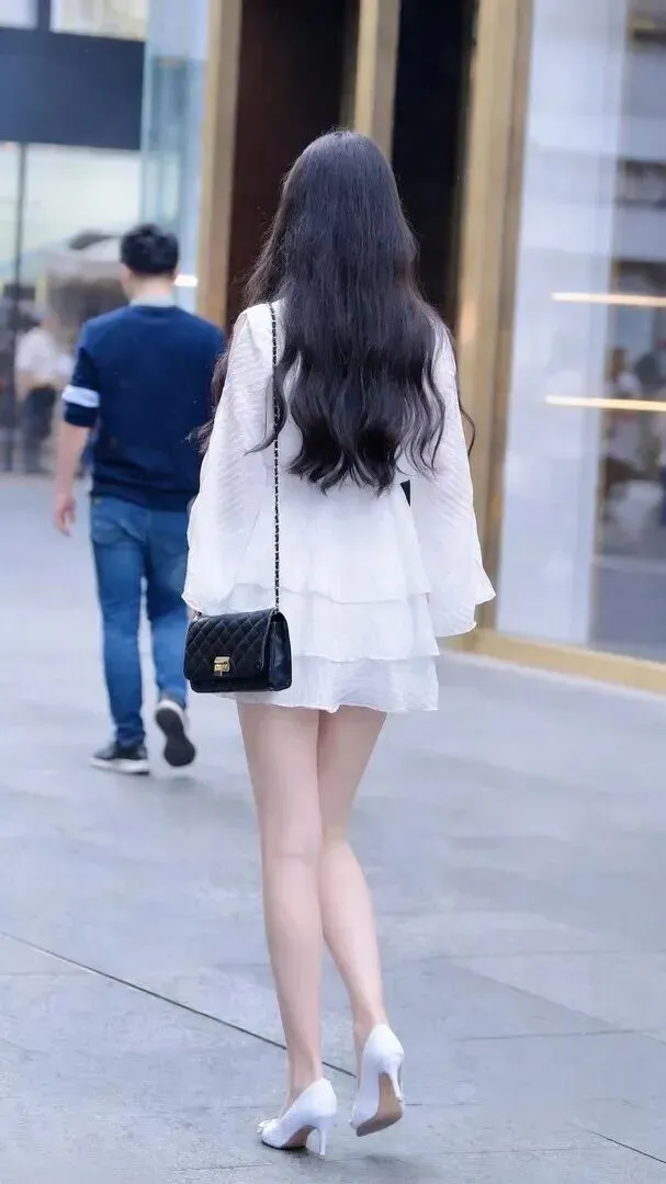 阳光下背影绝了,竖条纹白裙的喇叭袖、双层荷叶边裙摆一走路就飘起来。她行走的时候白色高跟鞋在光线的映照下闪烁着耀眼的光辉,黑色菱格纹包的气场也因此变得更加明显,所以才引起行人的注意去偷拍呢!
