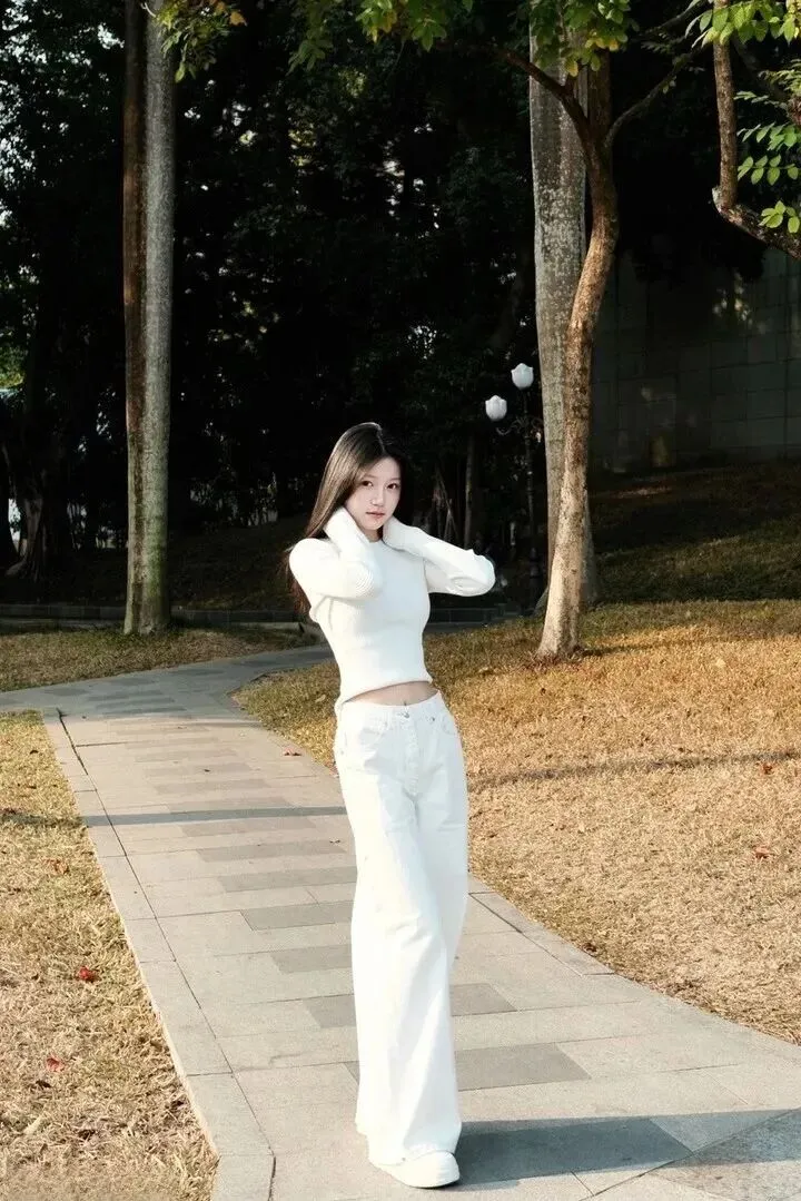 第一套就是短款针织衫加阔腿牛仔裤。米色针织衫为短款设计,轻轻露出腰部,显出腰部比较细长的效果。竖坑条纹理衣服看起来更显层次,视觉上也拉长了身材。她下身穿的纯白色阔腿牛仔裤宽松垂坠、十分舒服,并且藏肉效果好。穿着两双厚底休闲鞋,鞋的颜色是白色的,并且颜色一致。她在这座城市的公园里走着,阳光把她的身体包在温暖的圈子里,把她全身照得通明敞亮。