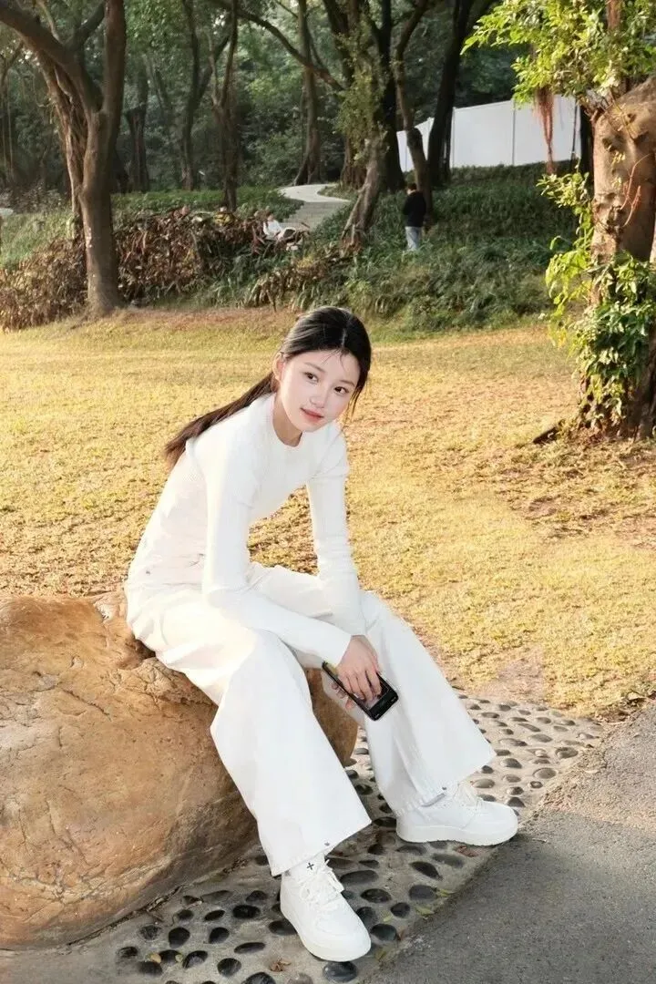 阔腿长裤穿搭随性自在。竖坑条针织上衣加阔腿裤,裤腿长飘飘,走路带风。她坐在石头上,手中拿着手机,眼睛里有光。秋风吹来的时候,人就轻松、舒服了。