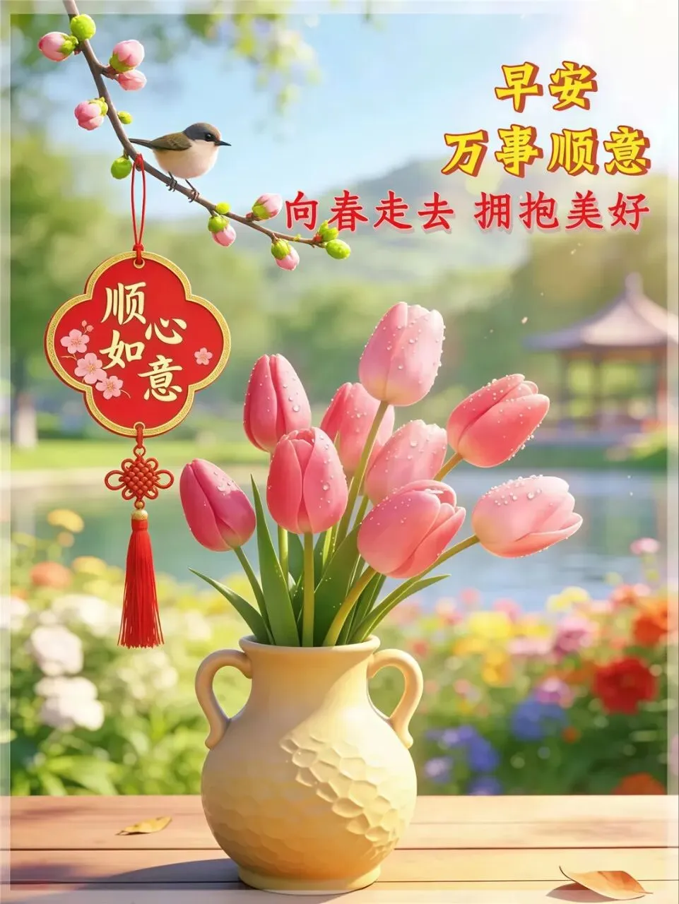 春水潺潺绕家门,桃红柳绿满园春,十里春风虽然好,愿你平安情最真,清晨漫步春光里,健康快乐伴晨昏。早上好!🌹🌸💯🌞🌺🎉